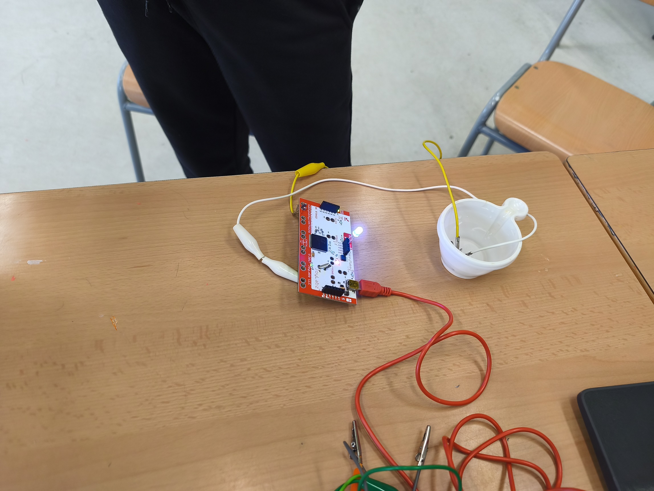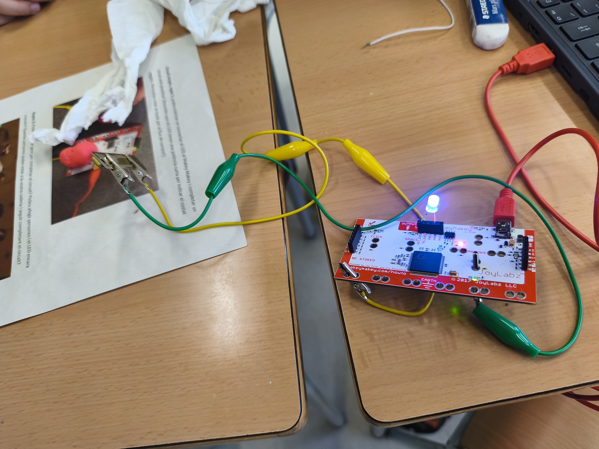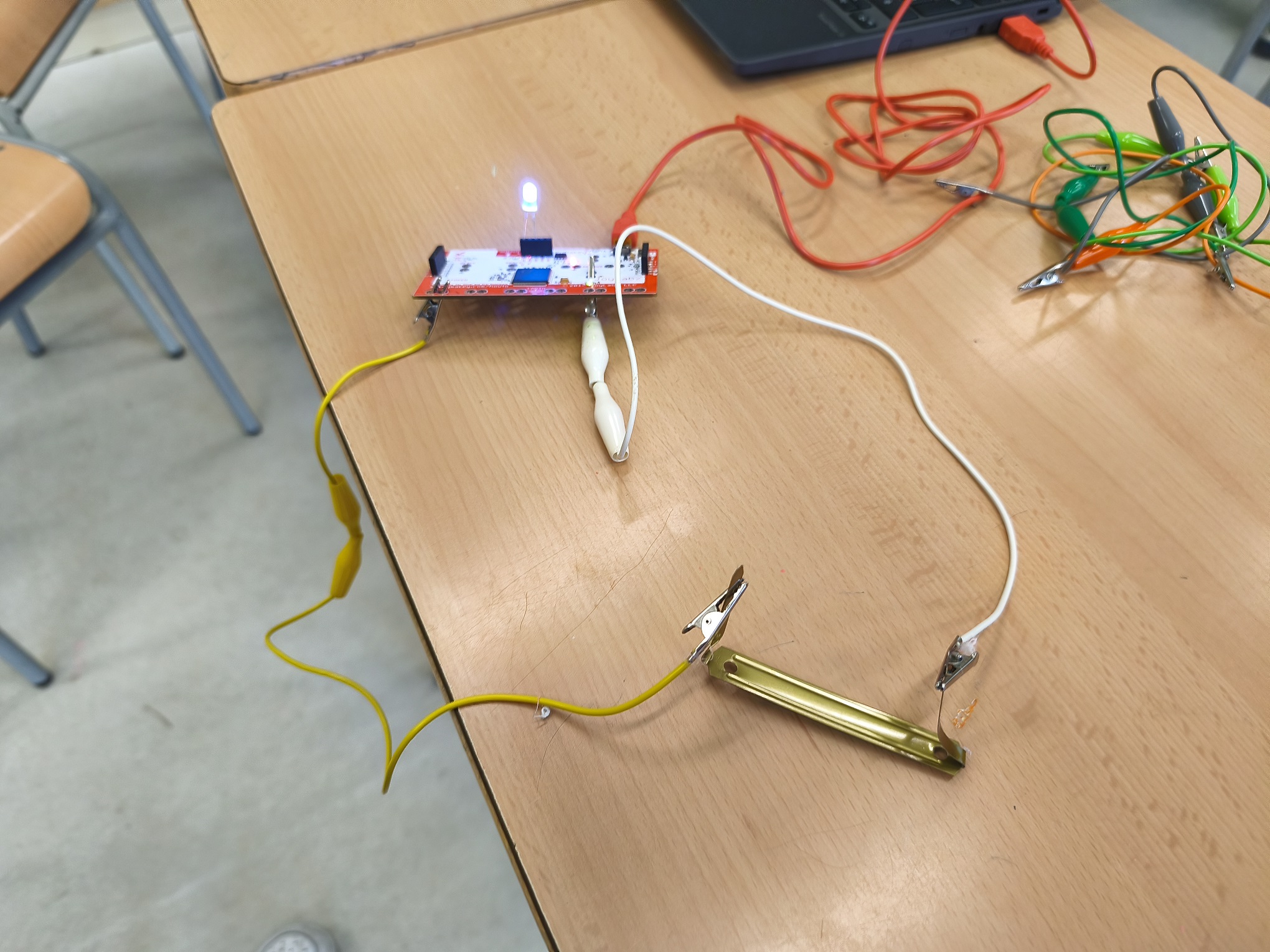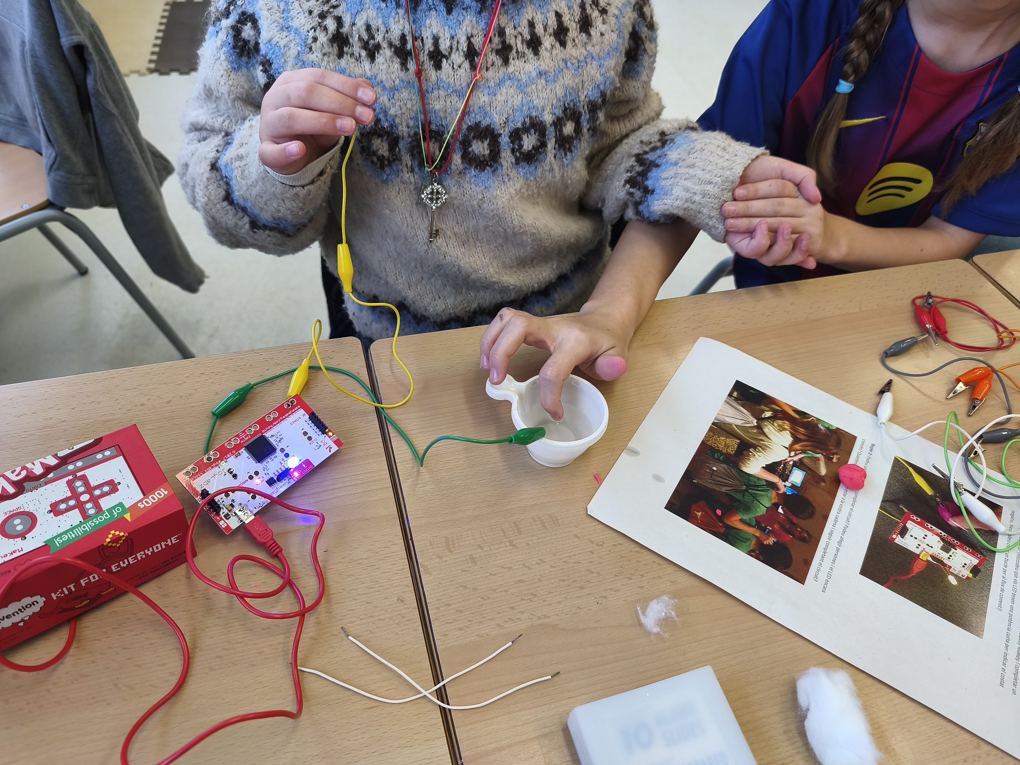A robòtica estem aprenent com funciona i com fer un circuit elèctric. Hem de crear un bucle perquè els electrons flueixin. Per tant, necessitem portar l’energia de la font d’alimentació cap al receptor “bombeta” i tornar a la font d’alimentació. Si creem un corrent amb èxit, la llum s’encendrà! També experimentem amb diferents materials per saber quins son conductors d’electricitat i quins no.