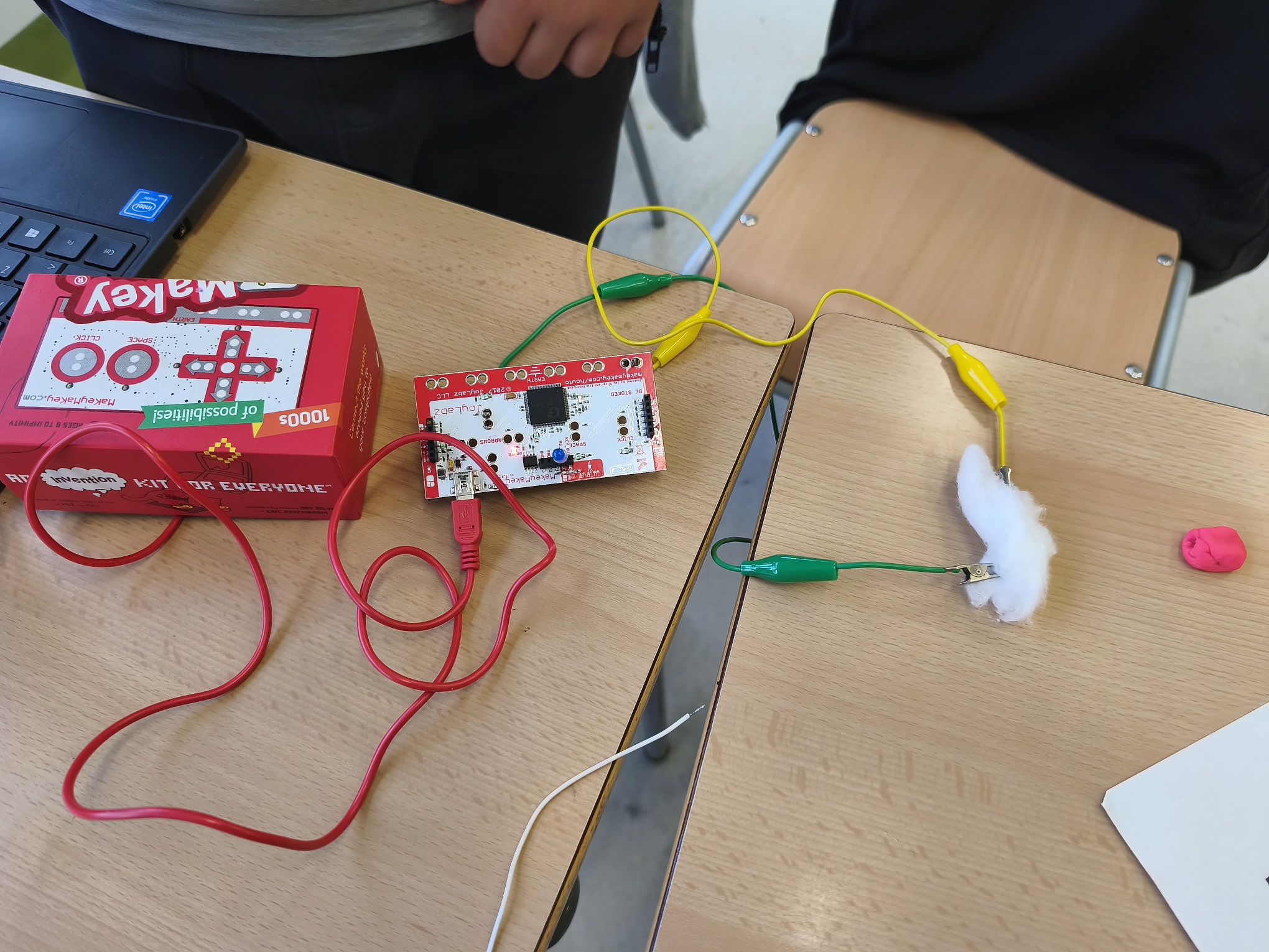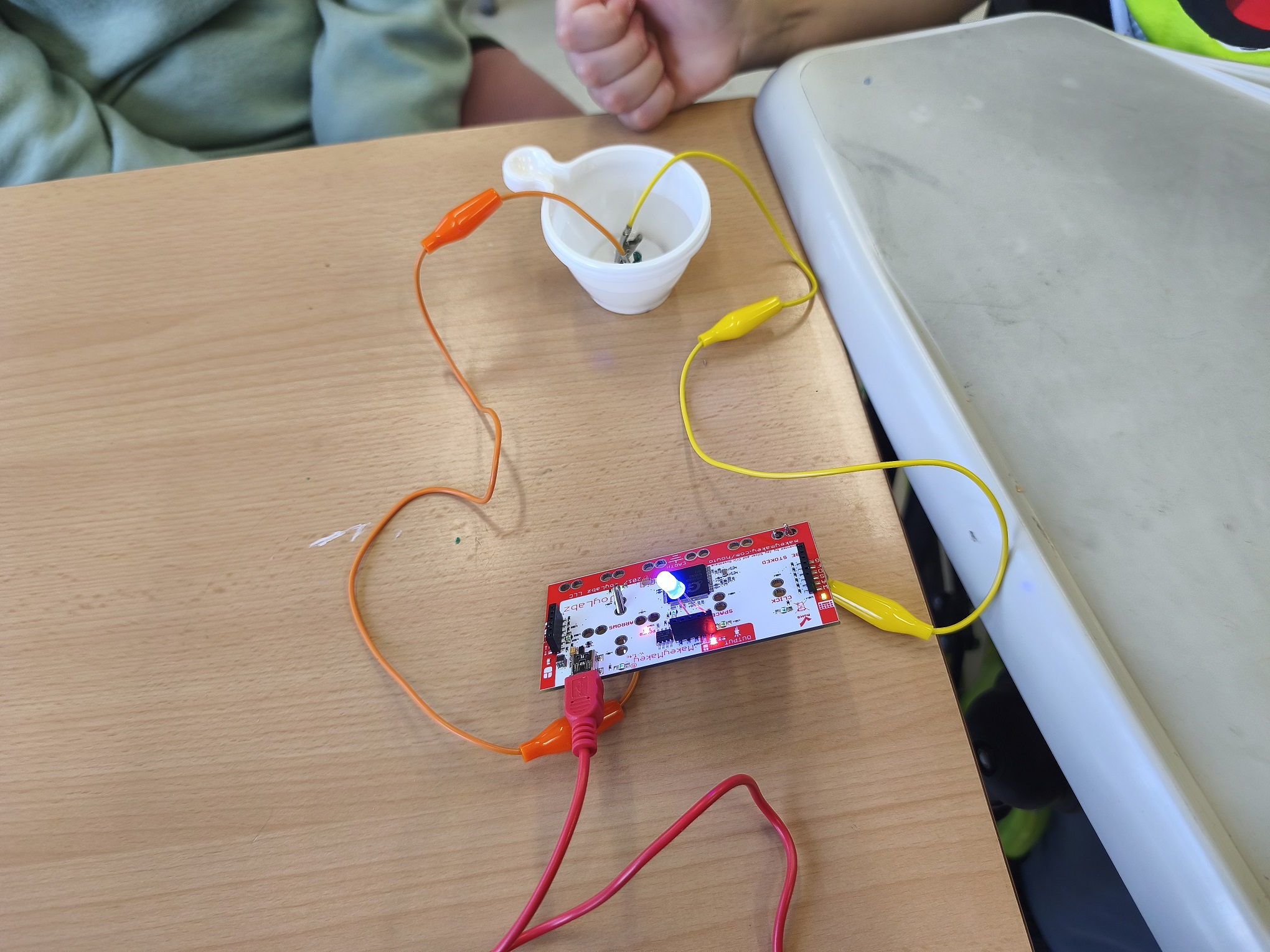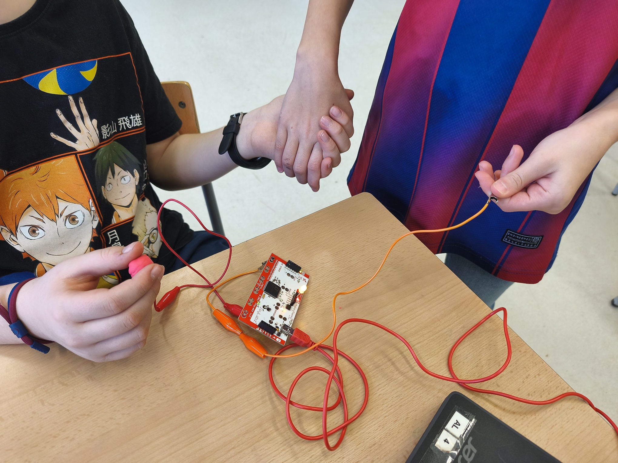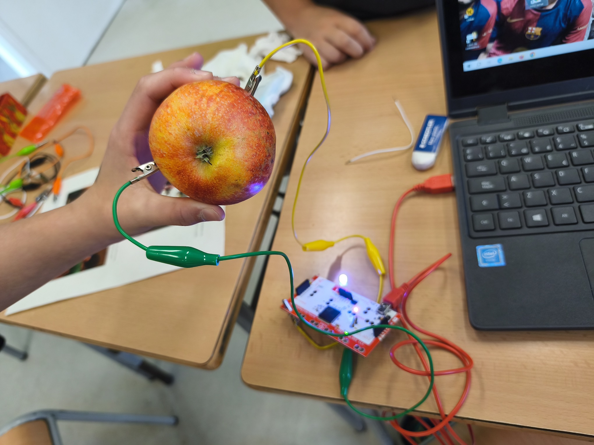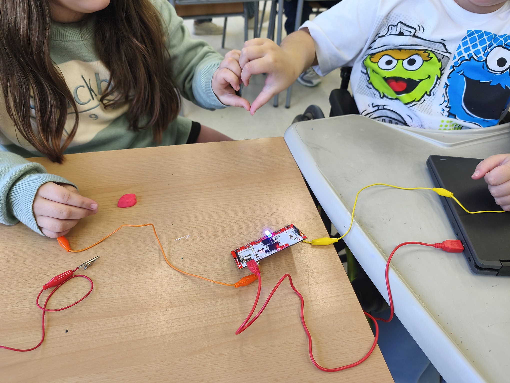A robòtica estem aprenent com funciona i com fer un circuit elèctric. Hem de crear un bucle perquè els electrons flueixin. Per tant, necessitem portar l’energia de la font d’alimentació cap al receptor “bombeta” i tornar a la font d’alimentació. Si creem un corrent amb èxit, la llum s’encendrà! També experimentem amb diferents materials per saber quins son conductors d’electricitat i quins no.