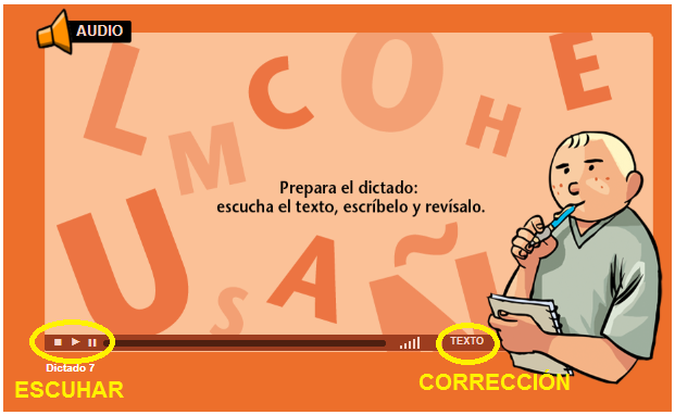 En la izquierda tenéis los botones para reproducir, parar o repetir dictado. Una vez lo tengáis hecho, a mano derecha, donde pone “texto”, podéis corregir el dictado.