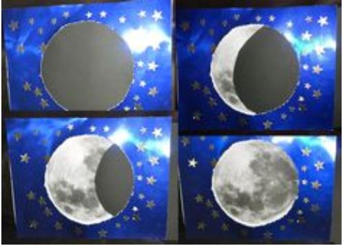 CONEIXEU LES FASES LUNARS? BUSQUEM LES FASES QUE EXISTEIXEN I LES PODEM CONSTRUIR COM EN AQUESTA IMATGE. a VEURE SI SABEU EN QUIN MOMENT DE LA FASE LUNAR ENS TROBEM ARA.