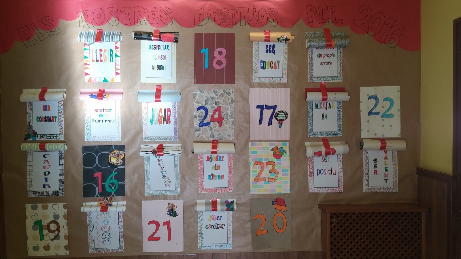 07/12/15Aquest any ens ha tocat decorar l’entrada de l’escola de Nadal i d’hivern en general. Hem aprofitat per fer un calendari d’advent amb els nostres desitjos pel 2016: