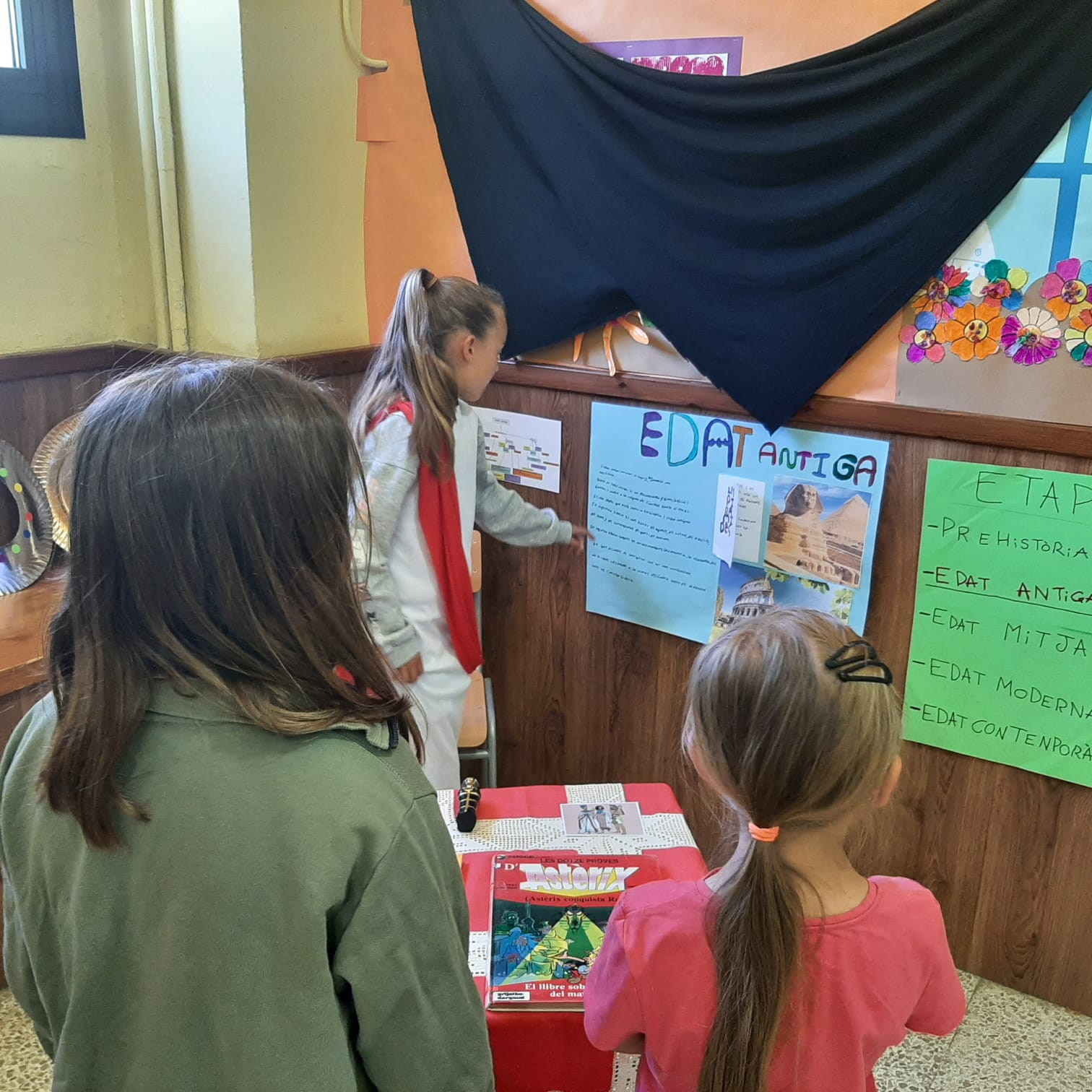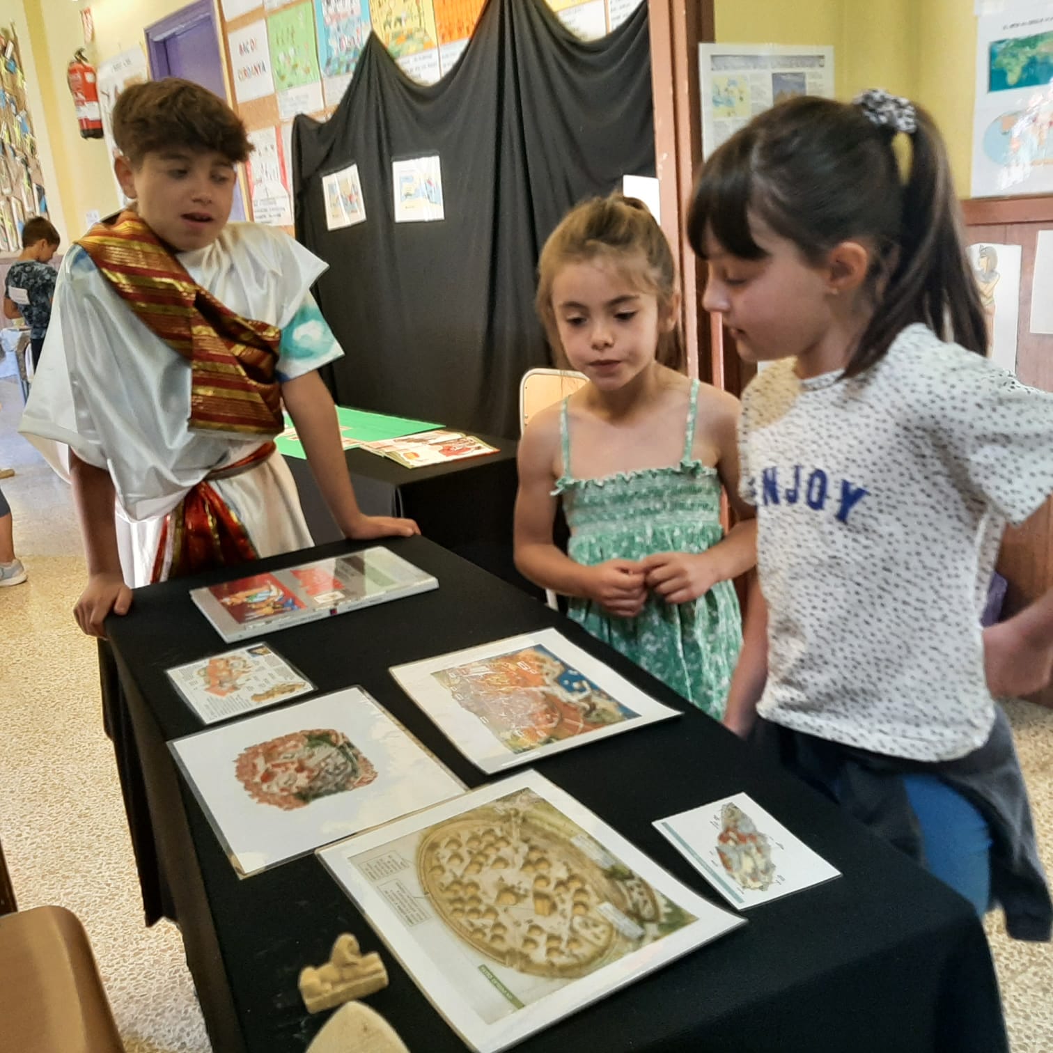 a l’entrada de l’escola ens esperaven ambientats de romans, grecs, egipcis, fenicis i altres personatges d’aquella època per explicar-nos un munt de coses: com vivien, com s’organitzaven, com feien els desplaçaments, per quins llocs es van moure, a què es dedicaven, com era la seva escriptura, …