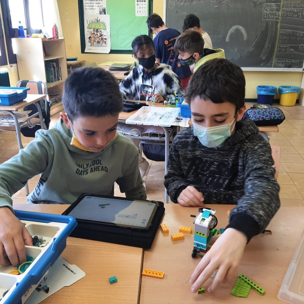 Durant el curs hem dedicat diferents sessions a construir i programar màquines amb peces de lego WeDo.  Vam començar amb màquines més senzilles i poc a poc ho hem anat complicant. Ha estat molt xulo perquè un cop fet el muntatge hem pogut connectar les màquines a una tauleta i, a través d’una aplicació, hem pogut programar les màquines per desplaçar-se, girar, ….