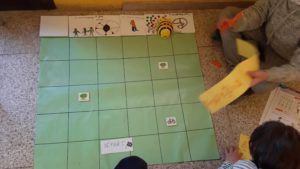 Nous avons appris le nom des jeux auxquels nous jouons dans la cour: aux billes, à cache-cahe, à l’élastique, au foot, à la corde à sauter,… Pour apprendre cela, chaque élève a créé un code des renseignements pour accéder aux différents jeux (Hem après el nom dels jocs de pati en francès: les caniques, a fet-i-amagar, la goma, futbol, la corda de saltar,…Per aprendre-ho, cada alumne a creat un codi d’indicacions per accedir als diferents jocs)
