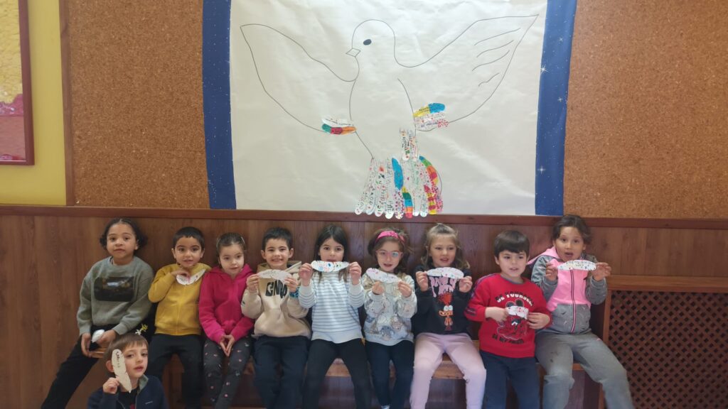 Aquesta setmana els nens i nenes de l’escola hem fet diverses activitats per celebrar el dia de la Pau. Hem treballat alguns poemes i contes relacionats amb la temàtica i hem decorat el colom de la pau amb unes plomes, on s’hi poden llegir paraules relacionades amb la Pau: respecte, amistat, estimar, estar amb la família, no violència, etc.