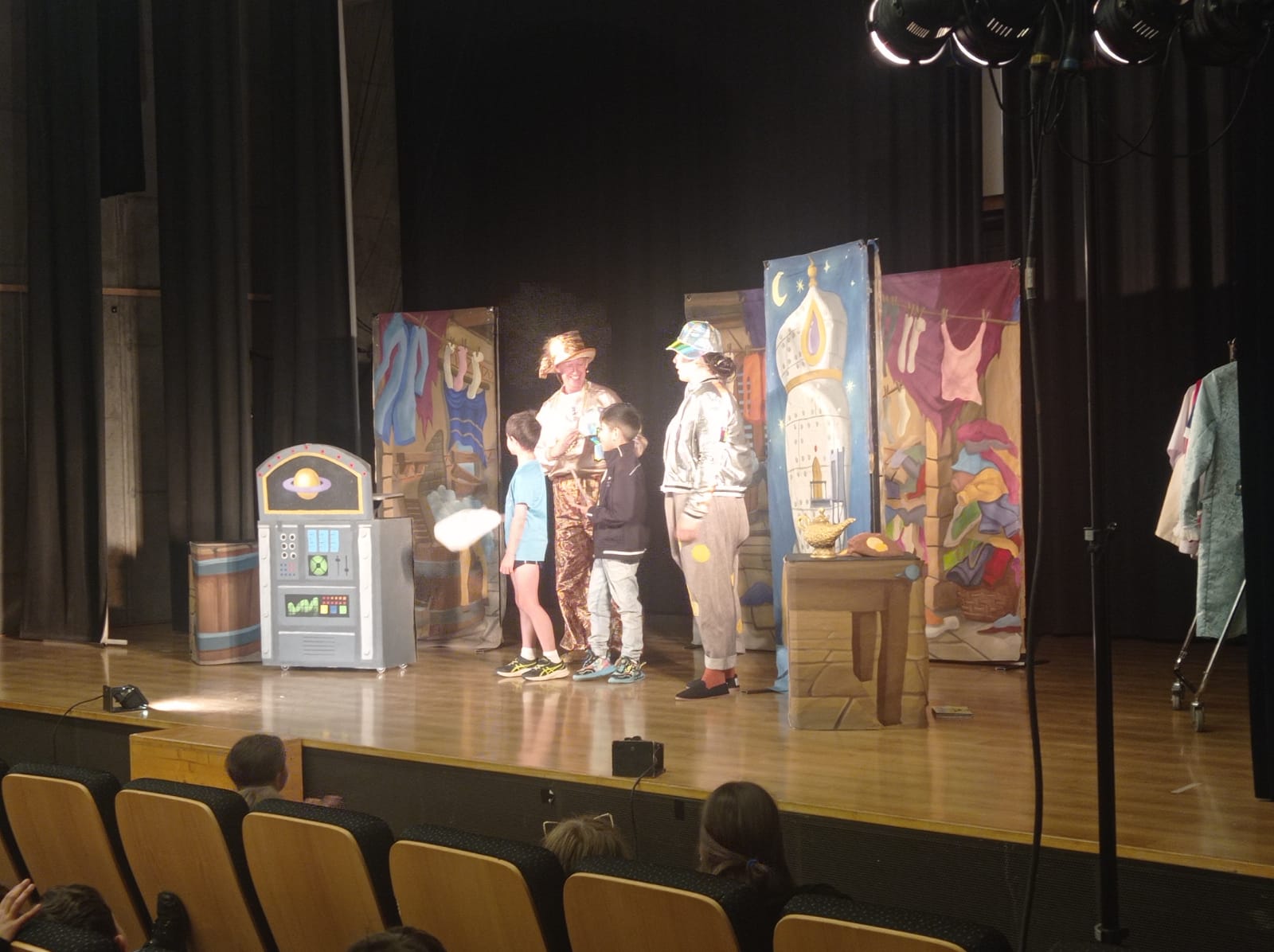 Els nens i nenes de 3r i 4t hem anat a Bellver a veure l’obra de teatre Aladin en anglès. La història ha estat una mica diferent de la que coneixíem, l’Aladín volia canviar de feina i desitjava probar diverses professions. Mentre les anava provant els infants hem pogut repassar vocabulari relacionat amb cadascuna d’elles.