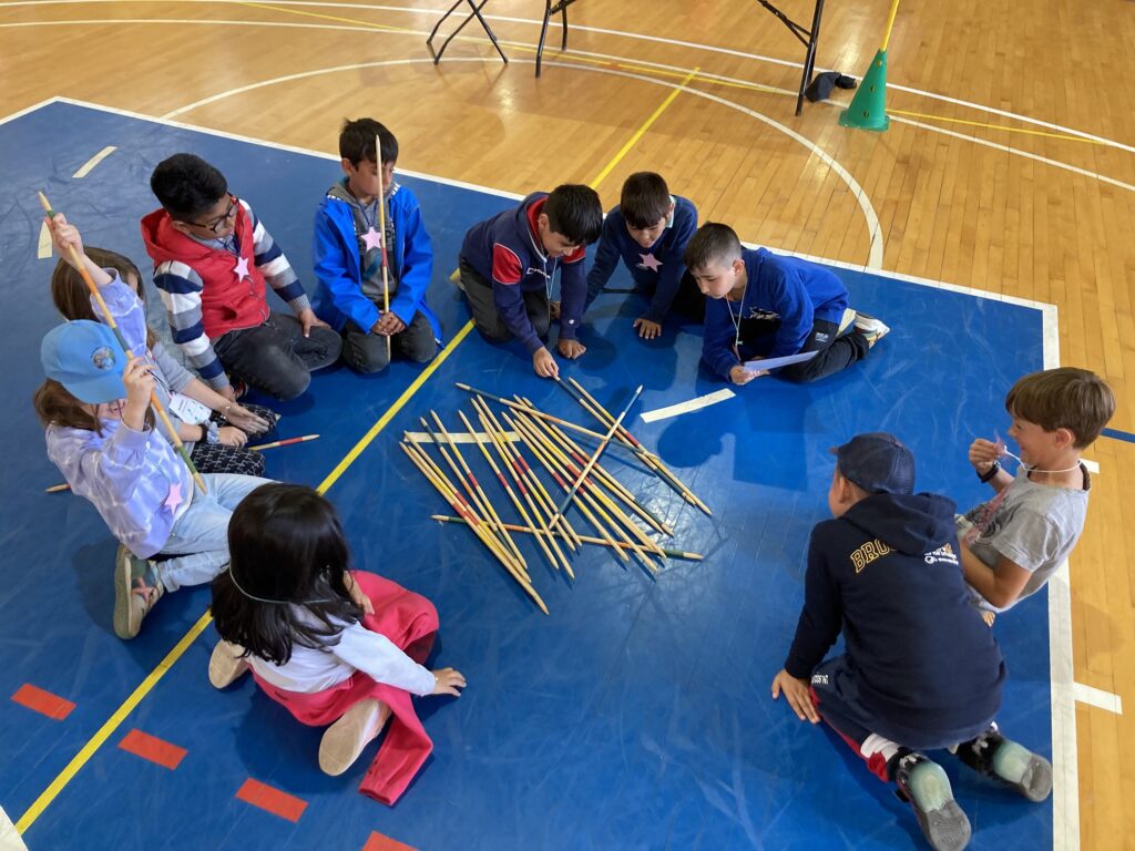 Vam fer tallers molt diferents: vam jugar al Mikado, vam fer construccions, vam mesurar-nos de diferents maneres, vam fer curses per descobrir quin cos geomètric ens faltava, vam muntar peces en perspectiva, vam fer un tangram gegant i vam intentar encistellar dins d’unes cordes.