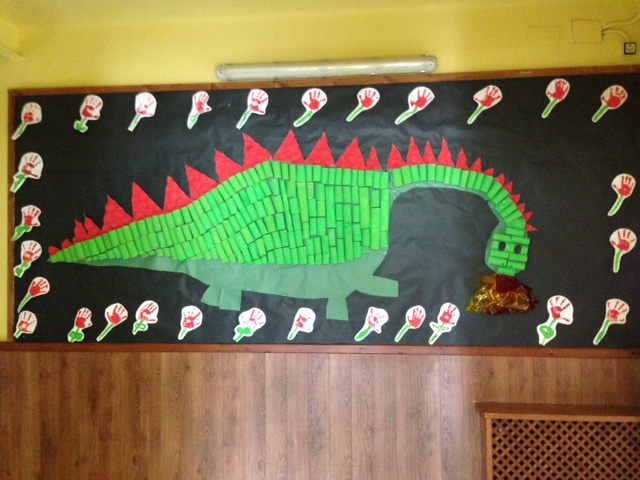 Els nens i nenes d’infantil hem decorat l’entrada de l’escola donant la benvinguda a la primavera i amb un drac de Sant Jordi ben divertit. També hem celebrat Sant Jordi decorant el passadís amb dibuixos de la llegenda de Sant Jordi i fent unes roses ben boniques.