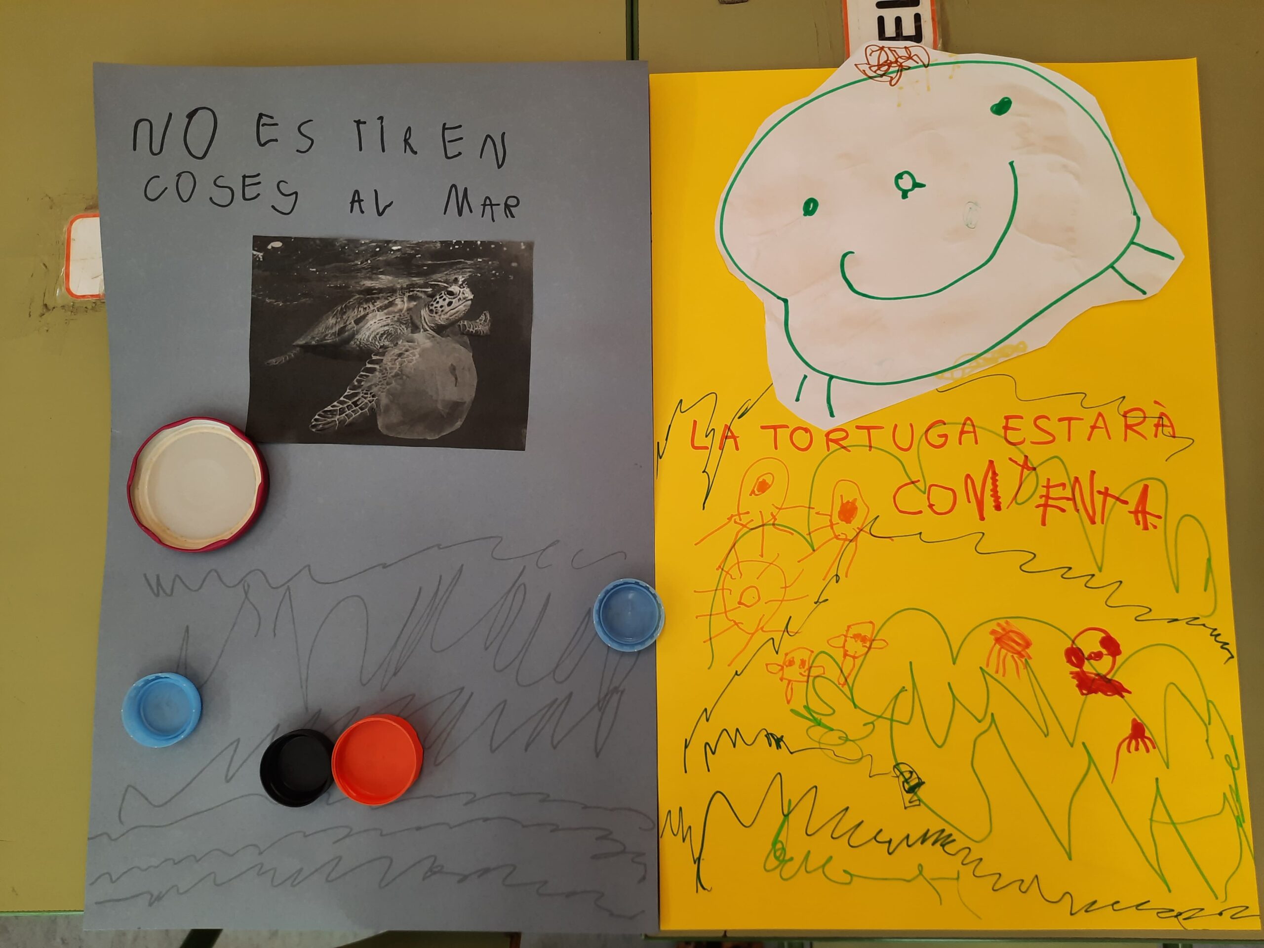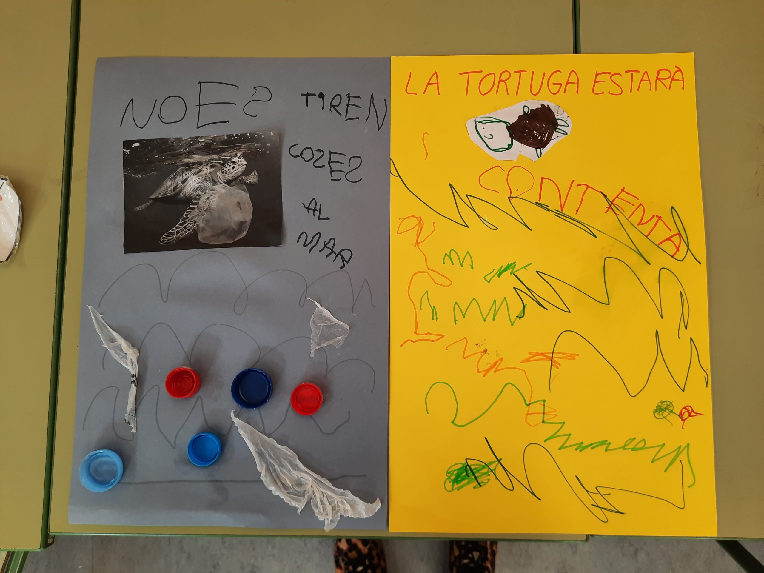 Arrel del projecte anual, hem estat treballant la tortuga marina. A partir d’un conte vam descobrir que les tortugues i molts animals marins estaven patint, ja que molts dels plàstics que utilitzem en el nostre dia a dia van a parar al mar. Per tal de prendre’n consciència de la problemàtica i per tal de poder buscar solucions, els infants d’I3 hem observat el voltant de l’escola per veure el volum de plàstics que hi havia pel terra. A més a més, hem pensat maneres per fer veure a tothom el perill d’utilitzar tants plàstics i no llençar-los on correspon. Una de les maneres va ser crear un cartell per penjar a l’escola i un altre per penjar al poble.