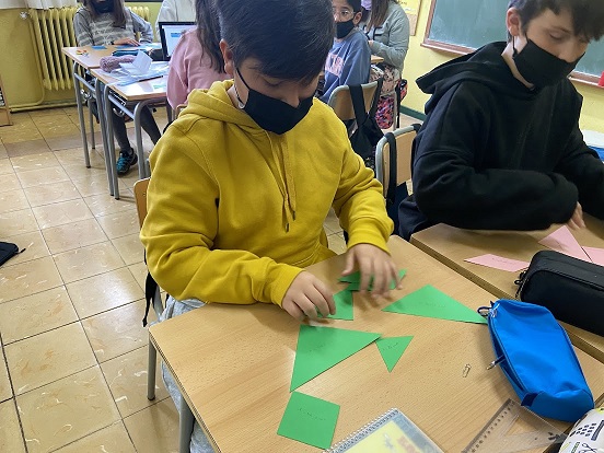 Per acabar aquest trimestre, a matemàtiques hem fet unes quantes sessions de geometria. Hem treballat les figures planes i per fer-ho ens hem fet cadascun un tangram amb cartolina que ens ha servit per veure de quines figures planes que està format, per mesurar-ne les àrees i per fer figures utilitzant les diferents peces.