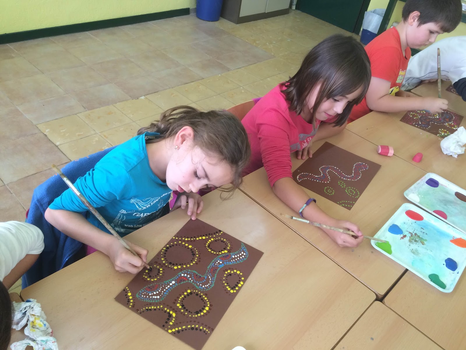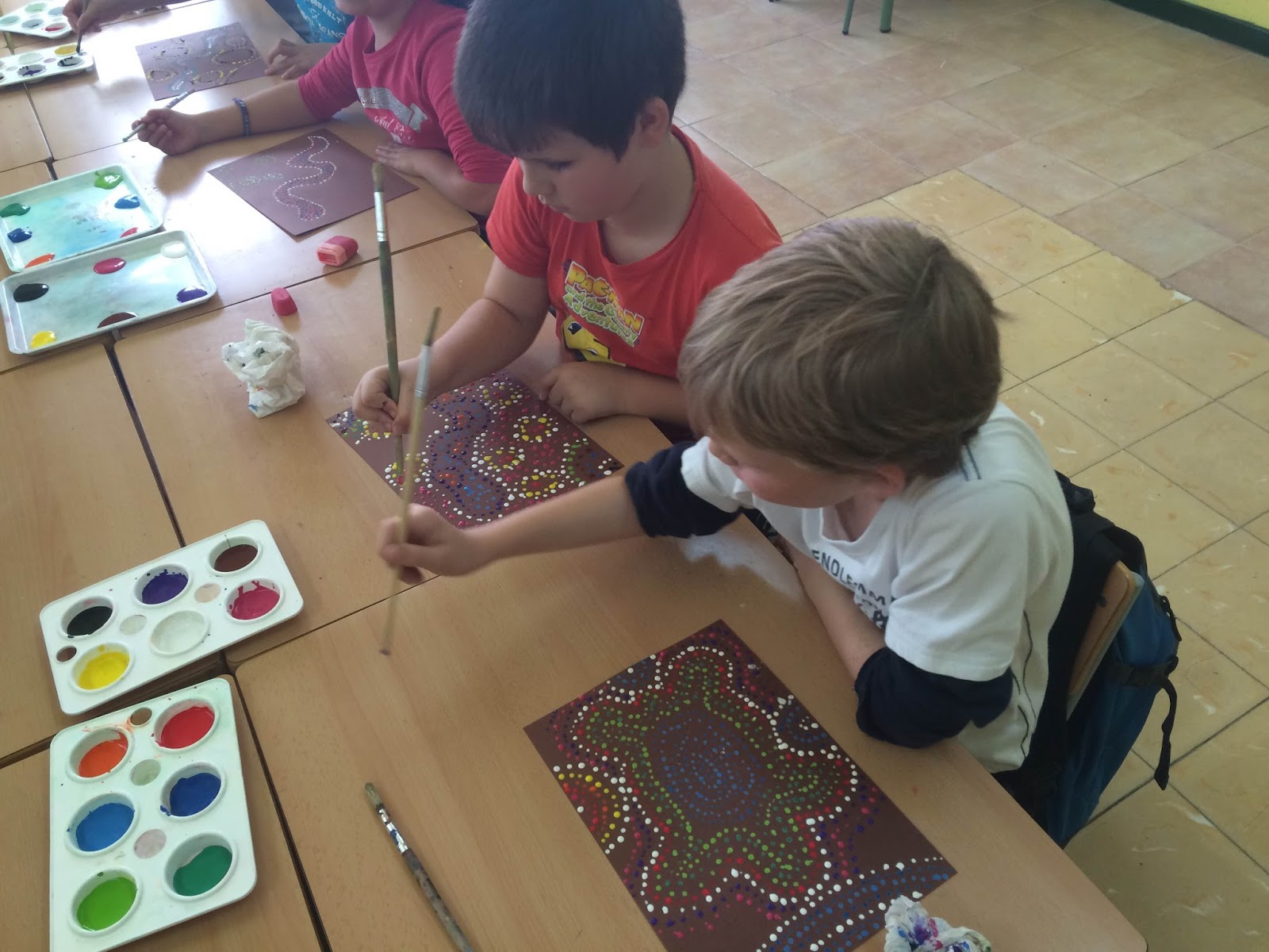 Avui els nens i nenes de Cicle Mitjà hem estat pintant com els Aborígens Australians! Hem dibuixat sargantanes, cangurs, serps, tortugues, peixos,.. i els hem pintat amb puntets de tots colors! Mireu què divertits ens han quedat!