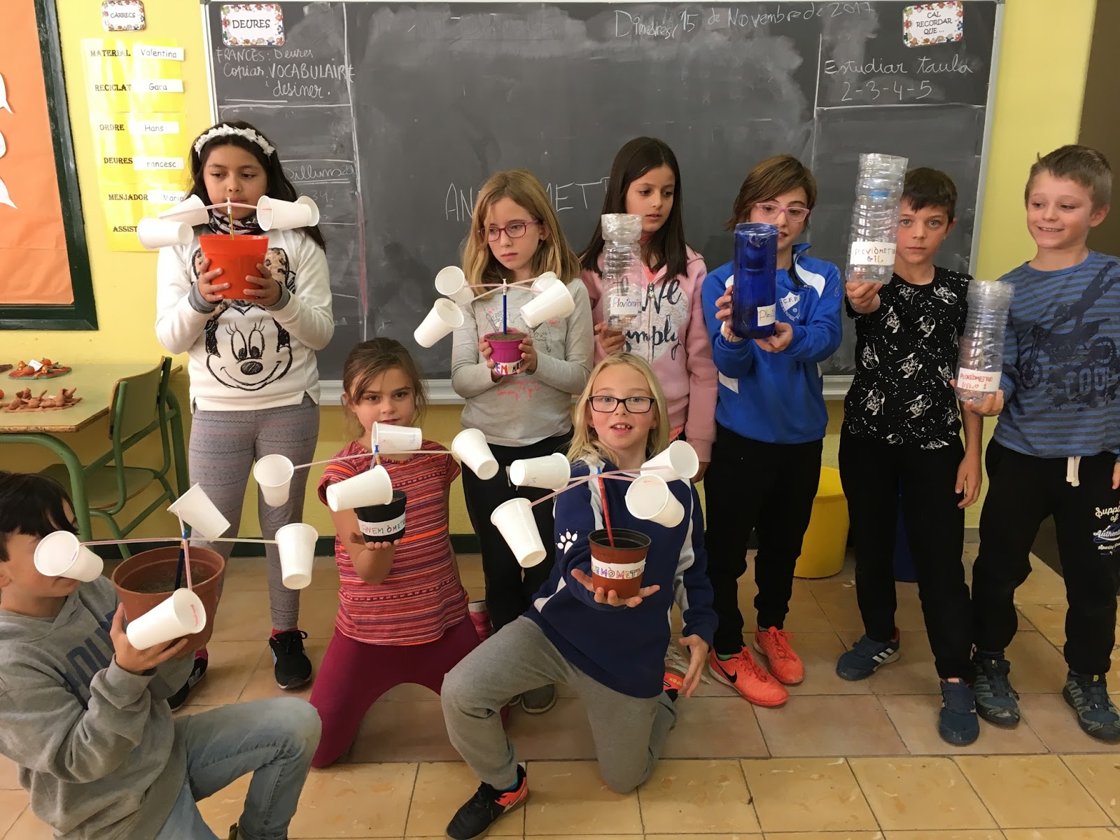 Per acabar el projecte de medi “Temps i clima”, els nens i nenes de 4t hem construït dos aparells meteorològics que prèviament hem treballat a classe, un pluviòmetre i un anemòmetre. Després, a la classe de català hem fet un text instructiu per explicar els materials que hem utilitzat i els passos que hem seguit per fer-los.