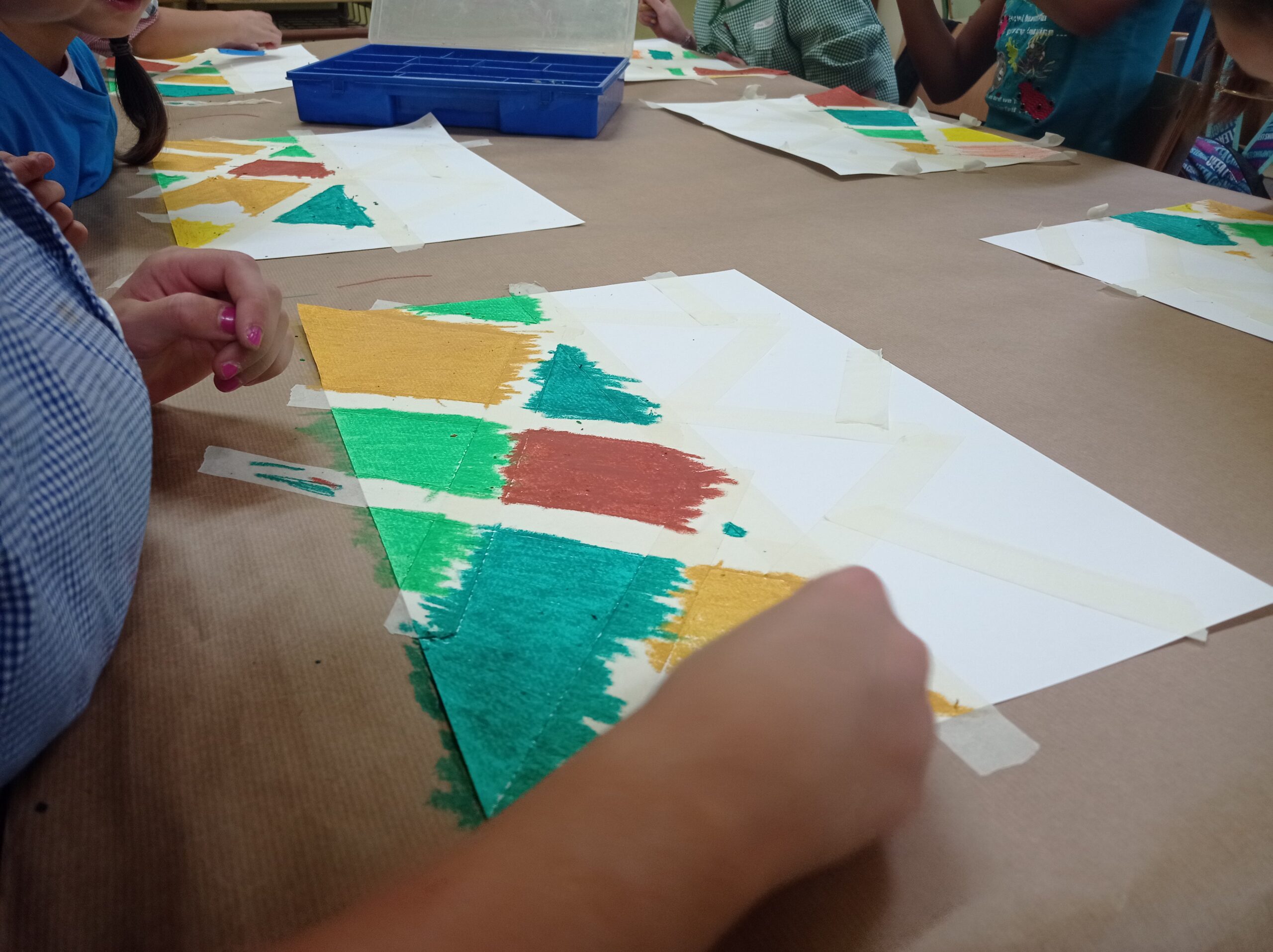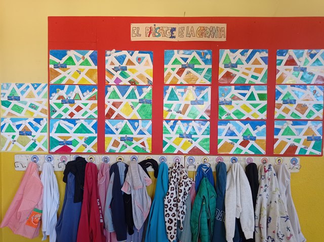 Un cop vist tot això, vam fer el paisatge d’una forma especial, posant cinta de pintor amb les formes que havíem vist i després, amb ceres, vam anar acolorint totes les parts. Al treure la cinta, van quedar aquestes formes especials. Finalment vam retallar tractors i globus, així com el poble de la nostra escola, Alp i els vam enganxar juntament amb una mica de cotó per representar els núvols.
