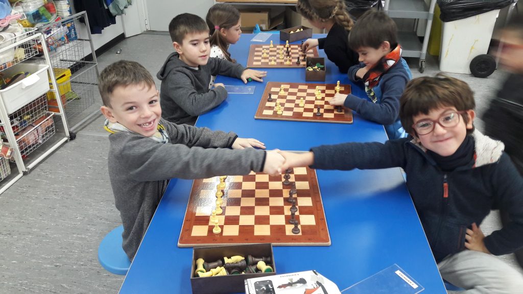 Els nens i les nenes de primer ja hem après un munt de coses d’escacs: abans de començar a jugar i després cal saludar-se cordialment (tot i que un/a guanyi perdi tant és).