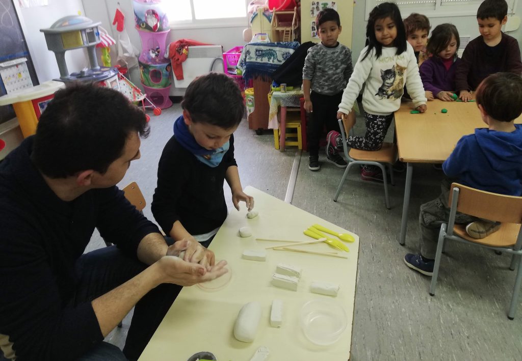 HEM COMENÇAT EL PROJECTE SOBRE L’ESCULTURA. JA SABÍEM COSES, COM QUE SÓN FIGURES QUIETES, QUE A VEGADES SÓN PERSONES… PERÒ CADA SETMANA ESTEM DESCOBRINT ARTISTES NOUS I NOVES AMB ELS QUE ESTEM DESCOBRINT QUE L’ESCULTURA NO SÓN NOMÉS ESTÀTUES. EN RAÜL, EL PARE DE L’ELÍAS ENS HA ENSENYAT COM FER UNA ESCULTURA QUE REPRESENTA UN