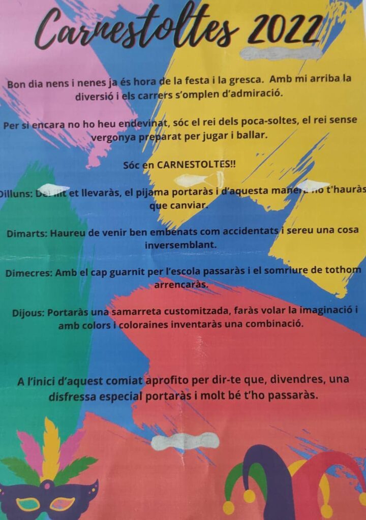 El divendres el Rei Carnestoltes ens va visitar a l’Escola i ens va dir unes consignes per aquesta divertida setmana de gresca i festa. El dilluns: del llit et llevaràs, el pijama portaràs i d’aquesta manera no t’hauràs que canviar. El dimarts: haureu de venir ben embenats com accidentats i sereu una cosa inversemblant. El