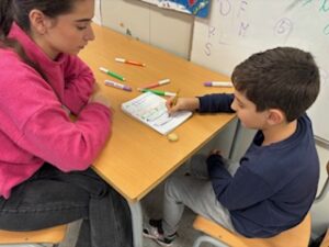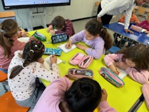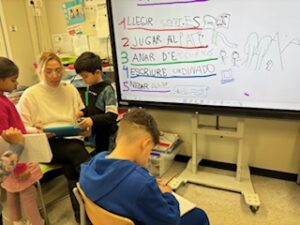 Per fer aquests tallers ens ajuntem primer I segon, ens dividim en quatre grups amb quatre mestres diferents que són l’Edurne, la Loli, la Silvia i la Laura. Fem activitats d’expressió escrita per exemple una activitat que hem fet és la rima, teníem una paraula i havíem de trobar una parella que rimi i fer rodolins. Aquestes activitats les fem en una llibreta de color groc, sempre que escrivim comencem fent un esborrany perquè ens ho corregeixin amb un codi, que són uns signes per saber on ens hem equivocat, quan ho corregim ho fem a net.