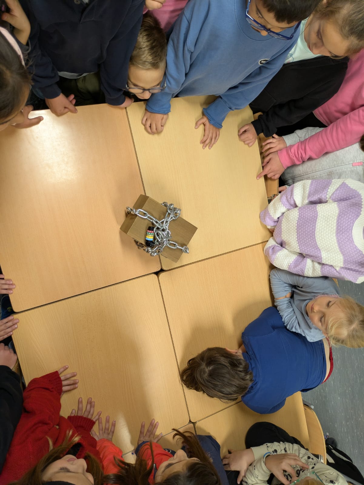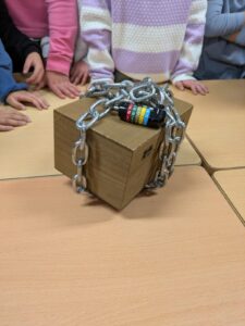 Per trobar el codi, havíem de resoldre reptes de les màquines simples i, cada vegada que acabàvem de fer un repte, ens sortia un nombre del codi i, fent tots els reptes, hem aconseguit els nombres del codi: 27193.