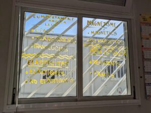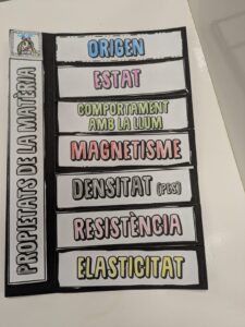 També hem anat escrivint les propietats de la matèria a les finestres. Les propietats són elasticitat, resistència, comportament amb la llum, magnetisme, estat i densitat.