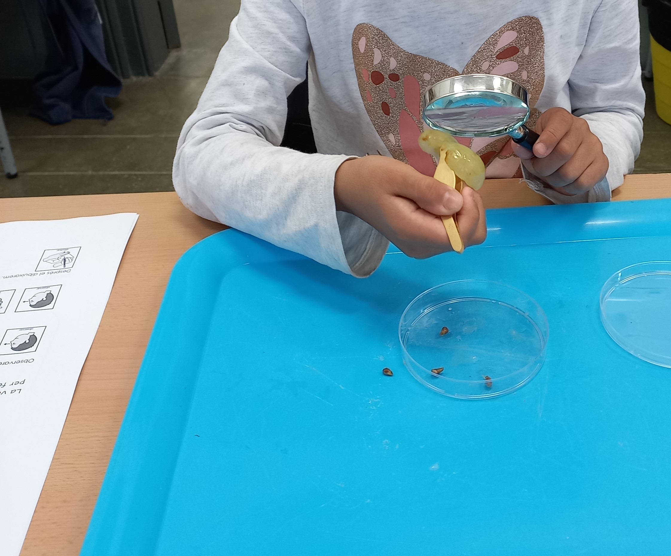 Mirem, observem, dibuixem i parlem. Les fruites de la tardor són tot un món per descobrir. Hem començat pel raïm. Ens preguntem com és, de quin color, com és la pell, la polpa i les llavors. El mirem, l’olorem, el tastem… L’ull ens fa veure’l d’una manera i anem ampliant amb la lupa de mà i amb la lupa binocular. Fem descobertes, les compartim i ens venen ganes de fer-ne més.