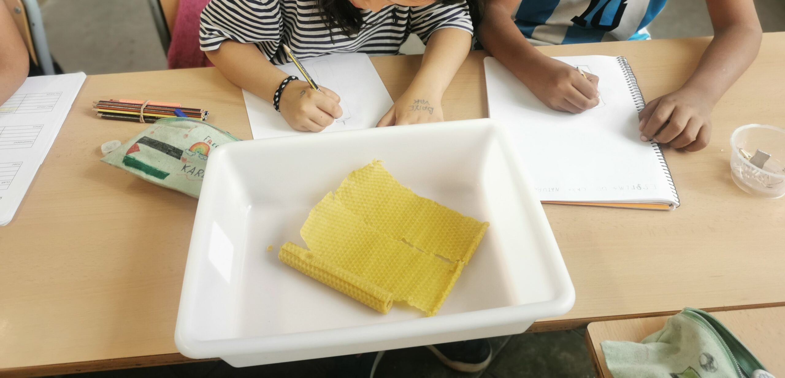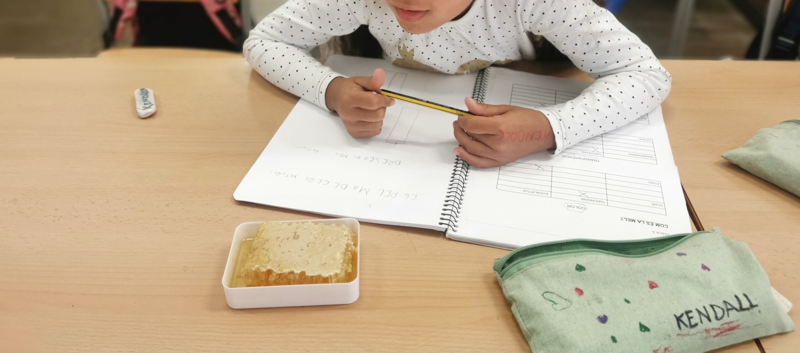 Amb ella aprenem una mica més sobre aquests insectes tan meravellosos. Polinitzen, fan mel i cera. Experimentem, toquem, olorem, tastem, mirem, comparem i llegim.