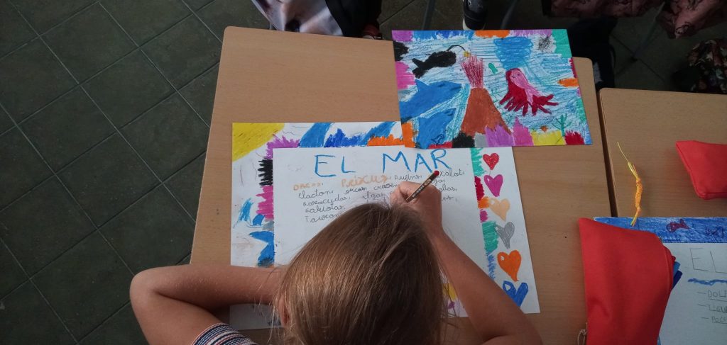 A cicle mitjà hem començat a dur a terme el projecte d’escola “el mar”. Hem estat recordant què sabem del mar, tot realitzant una activitat molt creativa, amb la qual cada alumna dibuixava amb ceres què significava per ella el mar i després escrivia paraules i frases relacionades sobre aquell dibuix. Després ens ho hem explicat entre totes.