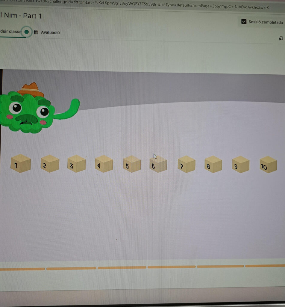 Els joc de Nim, són una família de jocs, en els que es parteix d’un conjunt de 10 cubets (o peces) damunt la taula i els jugadors van agafant per torn 1 o 2 cubets (la quantitat  que triïn cada vegada). L’objectiu és emportar-se l’últim cub i així es guanya el joc. Després amb les seves paraules,  s’ha de mostrar l’estratègia que han fet servir per guanyar i s’ha d’escriure al quadern. Verbalitzar-ho ens fa ser conscients dels camins que seguim per a aconseguir-ho. Han de descobrir l’estratègia que els servirà per guanyar.