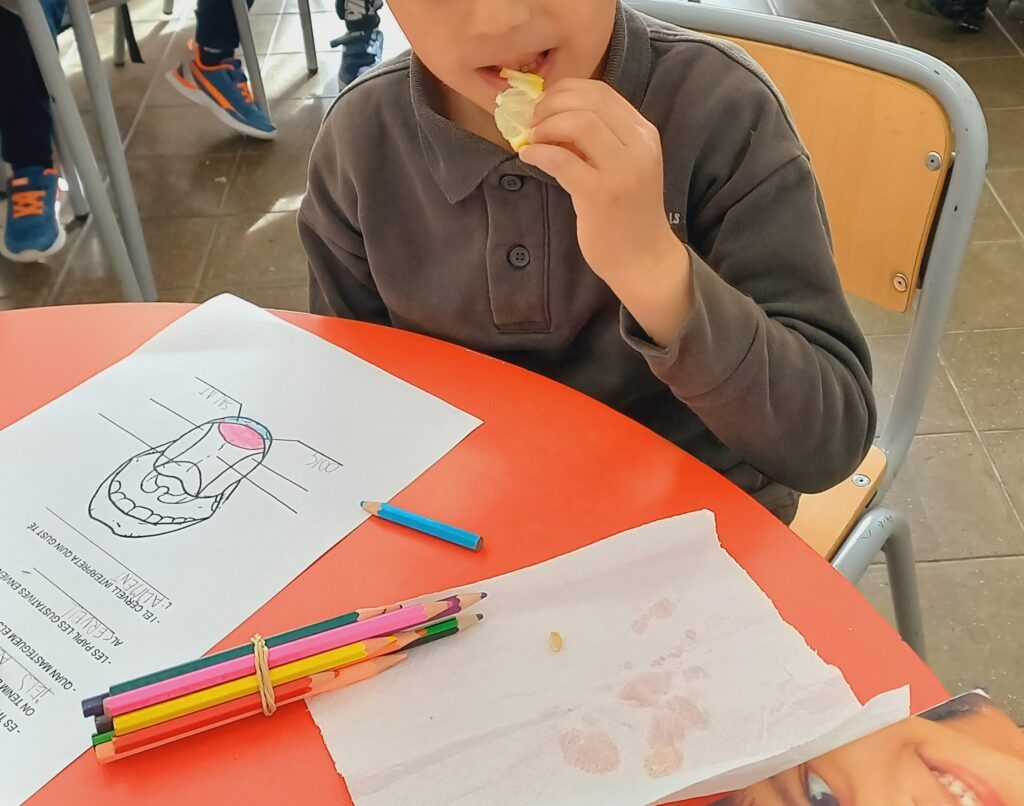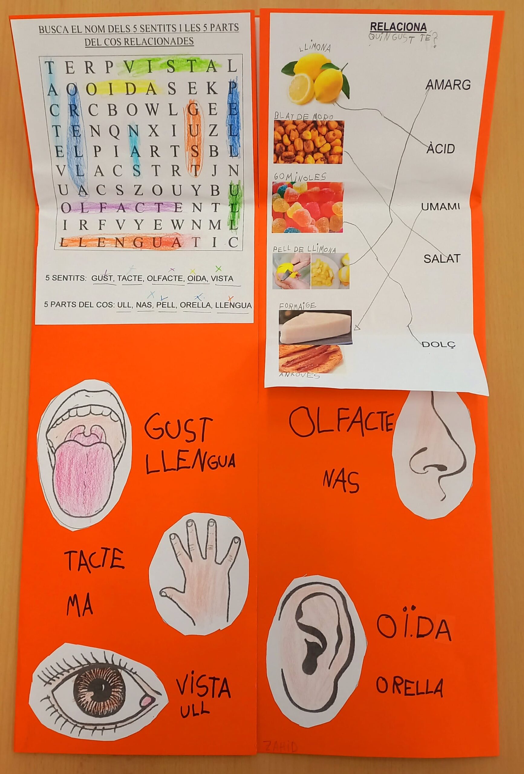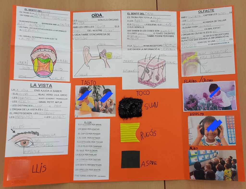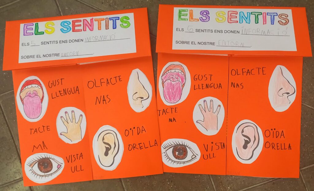 A 1r hem treballat els cinc sentits: la vista, l’oïda, el tacte, l’olfacte i el gust. Ens hem familiaritzat amb les parts dels seus òrgans: l’ull, el nas, la llengua, l’orella i la pell Hem experimentat amb els nostres sentits olorant farigola al pati del terrat, hem escoltat música, hem tastat llimona, llaminadures, blat de moro, la pell de la llimona i xocolata; i hem conegut el gust àcid, salat, dolç i amarg. També hem descobert que hi ha un nou gust que es diu umami que vol dir deliciós gust salat. Hem vist que tocant les coses podem saber si són suaus, rugoses, llises, dures, toves, o aspres. Amb la vista ens hem adonat que podem saber el color de les coses, les formes la mida o si estan lluny o a prop. Hem recollit totes les feines escrites en un lapbook.