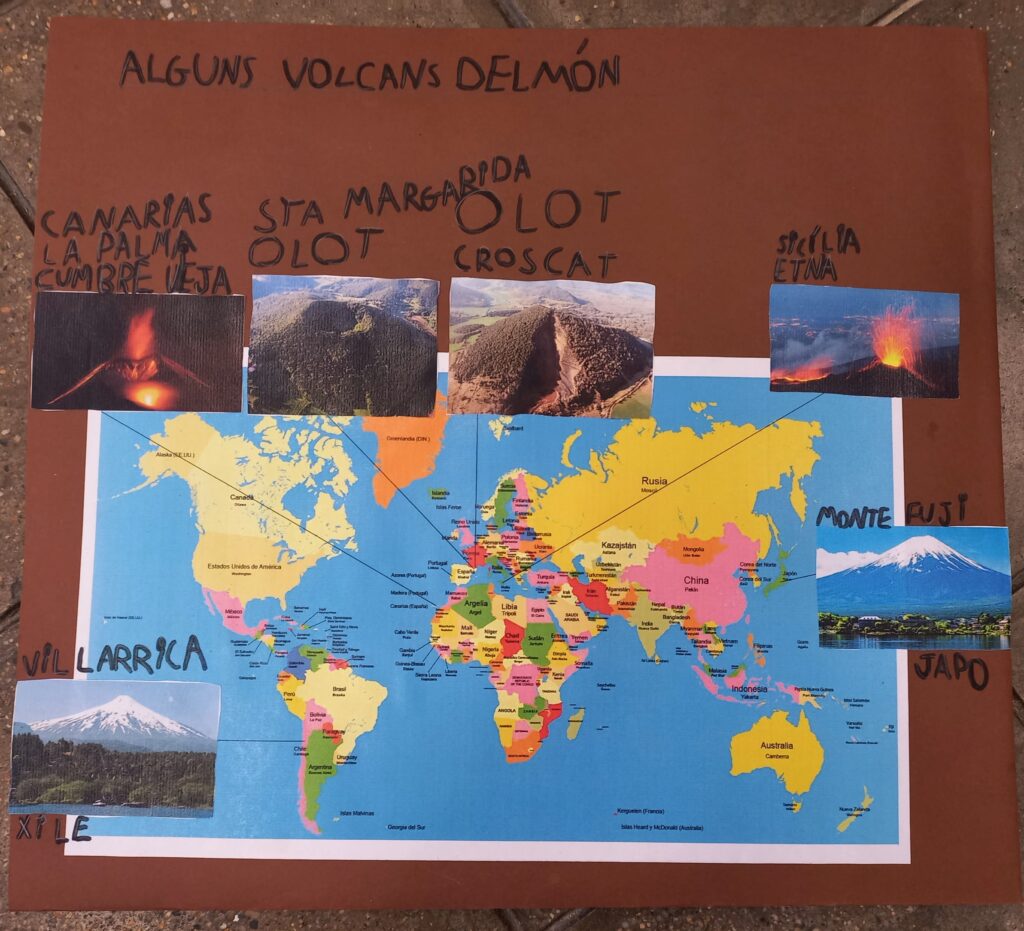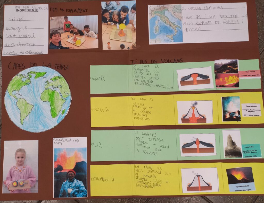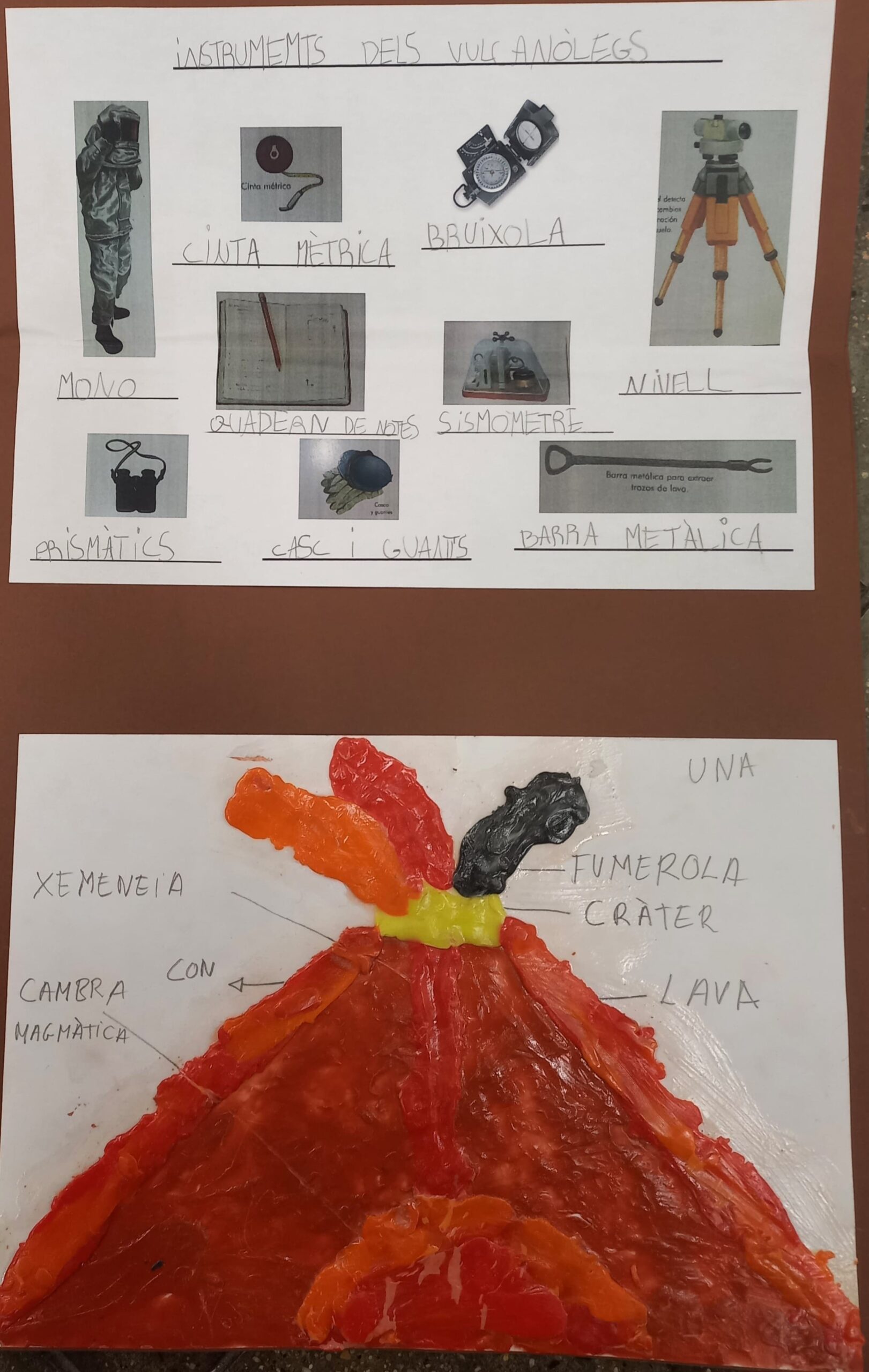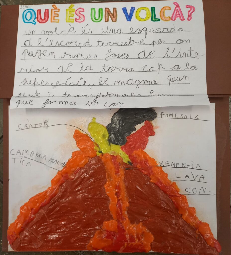 Els nens i nens de segon hem volgut saber com es formen els volcans. Primer hem posat amb comú que sabíem dels volcans i a partir d’aquí ens hem fet preguntes sobre el que volíem saber dels volcans. Després de buscar informació als llibres i veure algun vídeo sobre volcans hem fet el nostre volcà amb plastilina i hem escrit les seves parts. Hem trobat que hi ha quatre tipus de volcans segons la seva forma. Hem volgut saber quantes capes té la terra i també els instruments que utilitzen els vulcanòlegs i les vulcanòlogues. Hem situat alguns volcans en el mapa del món i finalment hem fet l’experiment d’un volcà. Tot ho hem recollit en un lapbook i així hem ampliat el nostre vocabulari i el nostre coneixement sobre els fenòmens del nostre planeta.