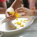 Agafem l’autocar i arribem a la casa. Una gran esplanada, un sorral i un munt de casetes ens esperen per jugar. Esmorzem, juguem i fem una visita a l’hort i a les plantes aromàtiques. Aprenem a fer crema per les mans amb oli de calèndula. També ens pot anar bé si tenim una ferideta o un cop. La calèndula cura.