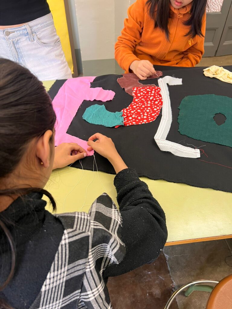 Aviat tothom podrà veure la creació feta al Laboratori Artístic de 3D, el qual hem fet en anglès i hem treballat de forma conjunta amb els grups de 3r i 4t. Els grups que van començar es van dedicar a fer els motlles de les lletres, cada una fent les lletres i escollint algunes de les teles, començant a retallar-les i unir-les, i passant aquestes tasques als grups que venien després. Per acabar, els últims grups van cosir les lletres a la tela de la pancarta, ajudant-se les unes a les altres i escollint els espais corresponents.
