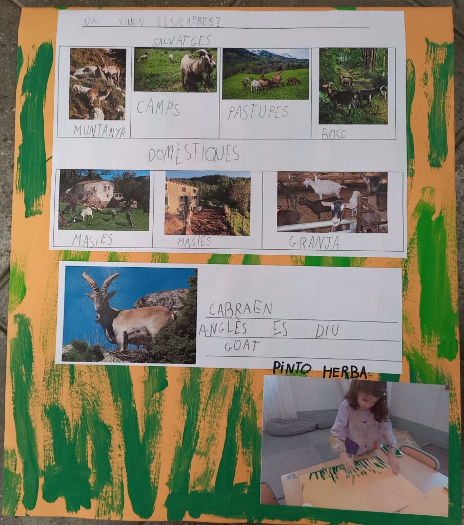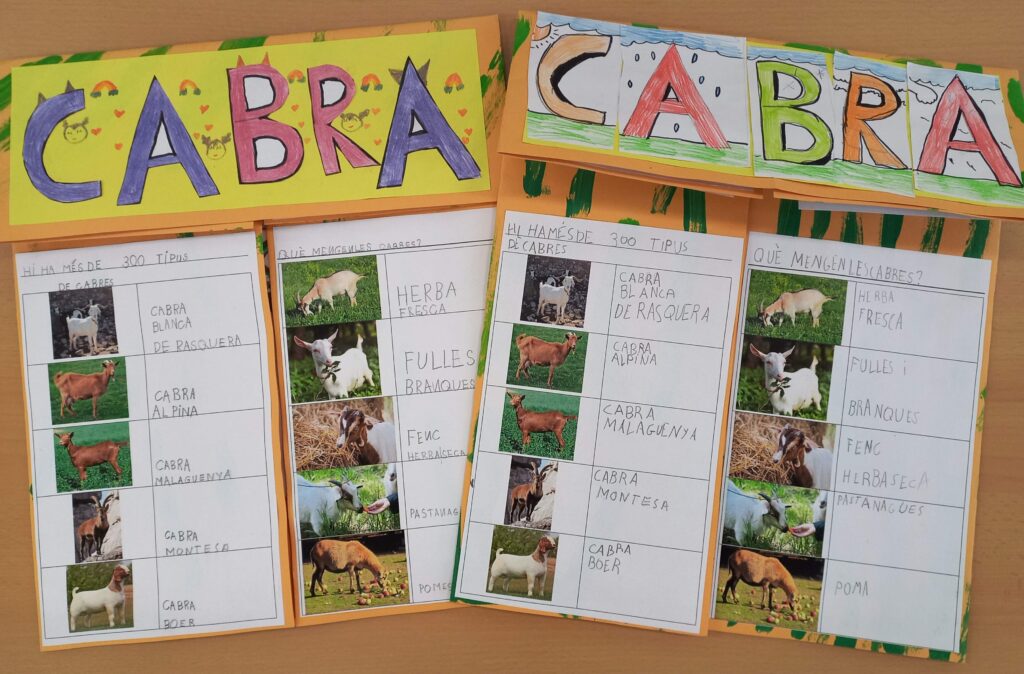 Els nens i nenes de primer ens hem interessat per les cabres. Cada un dels i les alumnes ha fet una petita exposició sobre aquest mamífer. Hem après les parts del cos de la cabra en català, en castellà i en anglès gràcies a la diversitat lingüística de la nostra aula. També què mengen, tipus de cabres, on viuen, perquè és un mamífer, com és l’esquelet, quina forma té la seva petjada, que capricorn està representat per una cabra, que “goat” és cabra en anglès, com funciona el seu estómac, la família de les cabres i els seus beneficis. Hem explicat el conte de “La cabra pometa”. Amb tot hem ampliat el nostre vocabulari amb paraules com: boc, peülla, petjada, salvatge, domèstica o remugar entre d’altres. Totes les feines que hem fet han quedat recollides en un lapbook.