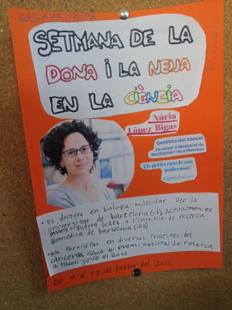La setmana passada vam treballar la setmana de la dona i la nena en la ciència. Les alumnes de cicle mitjà van realitzar diferents experiments d’assaig i error per a descobrir el mètode científic i reflexionar sobre aquest. A més a més, van fer un treball de visibilització de diferents dones científiques catalanes. A aquest enllaç trobareu més imatges relacionades amb aquesta temàtica.