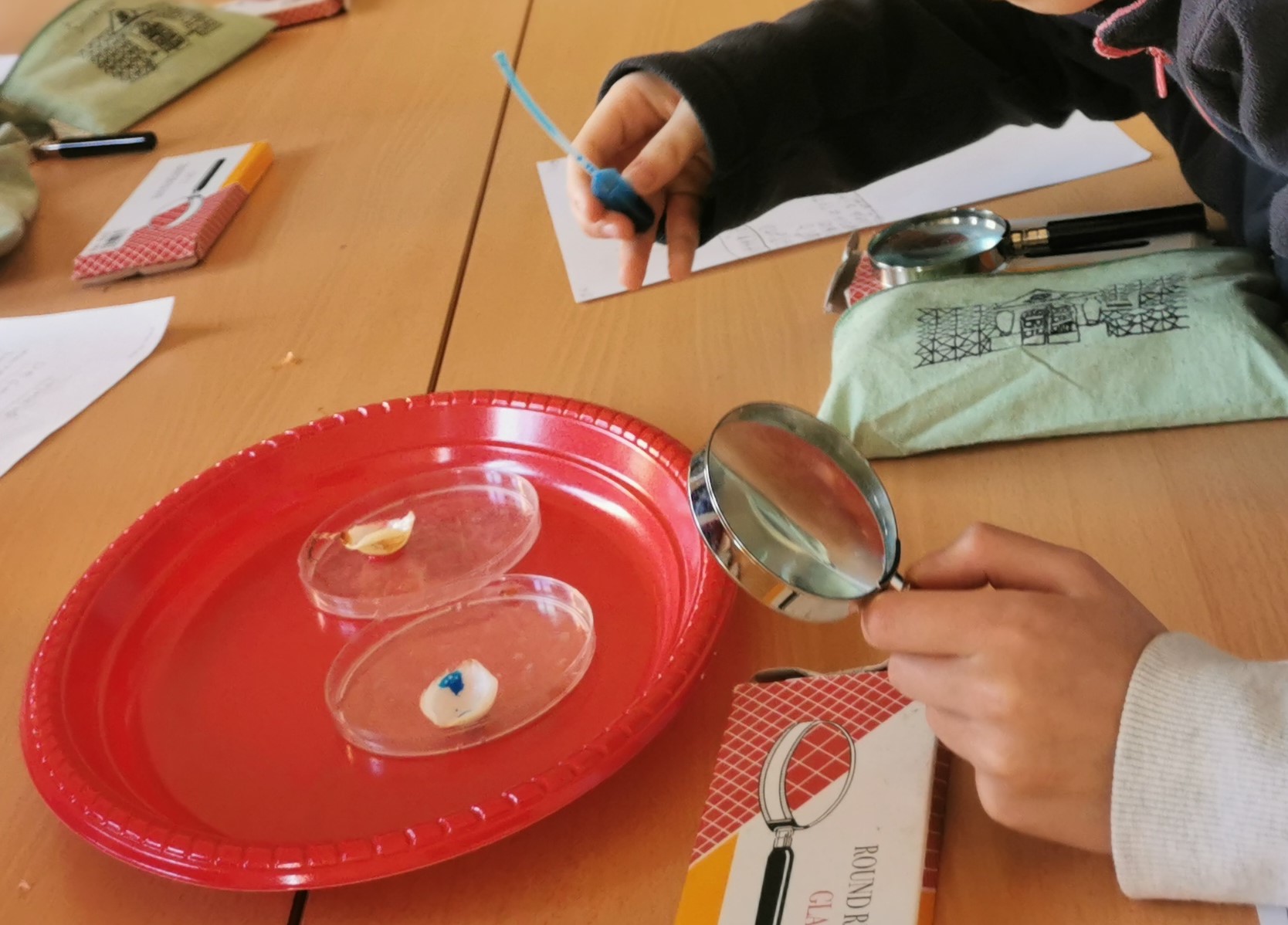 Hem fet servir càpsules de petri, pinces, lupes de mà, colorant alimentari i lupes binoculars.