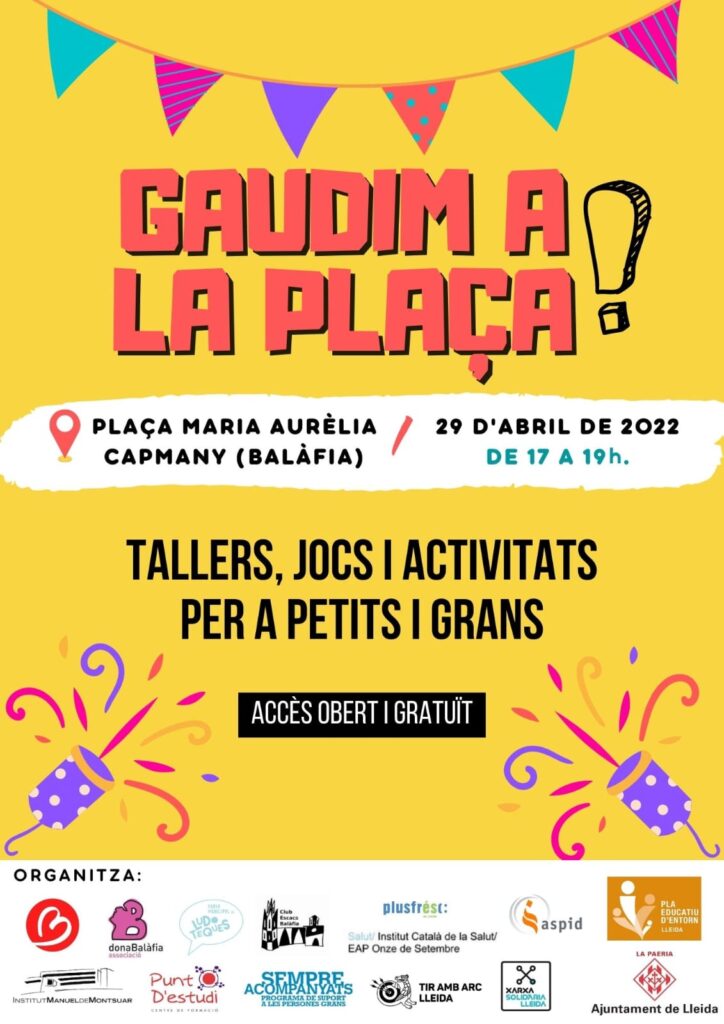 La comissió escola i entorn del barri de Balàfia, en el marc del Pla Educatiu d’Entorn de Lleida, ha organitzat la V edició del “Gaudim a la plaça” per aquest divendres 29 d’abril, de 17 a 19 h., a la plaça Maria Aurèlia Capmany, al costat del Centre Cívic del barri. La jornada preveu diverses activitats obertes a infants i adolescents i les seves famílies perquè puguin compartir espais de lleure, aprenentatge i socialització. La iniciativa compta amb la participació de diverses entitats del barri.