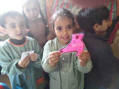 Ens va portar una sorpresa: la seva cançó impresa per pintar-la i portar-la a casa i poder-la assajar amb els germans grans, pares, mares…