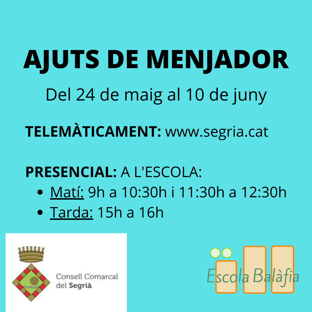 Des d’avui 24 de maig fins al 10 de juny estarà obert el període de presentació de sol·licituds de beques menjador pel curs que ve 22/23.