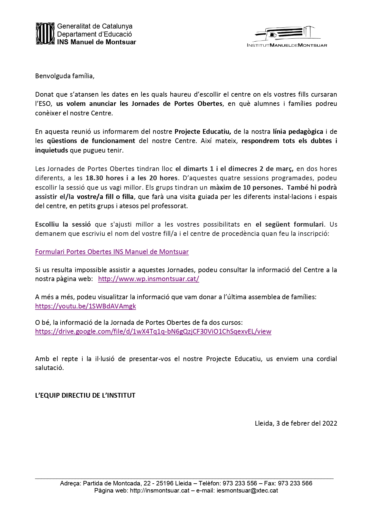 El dia 9 de març comença la preinscripció a l’ESO, per aquest motiu, l’Institut Manuel de Montsuar us convida a participar en les JORNADES DE PORTES OBERTES del seu centre.