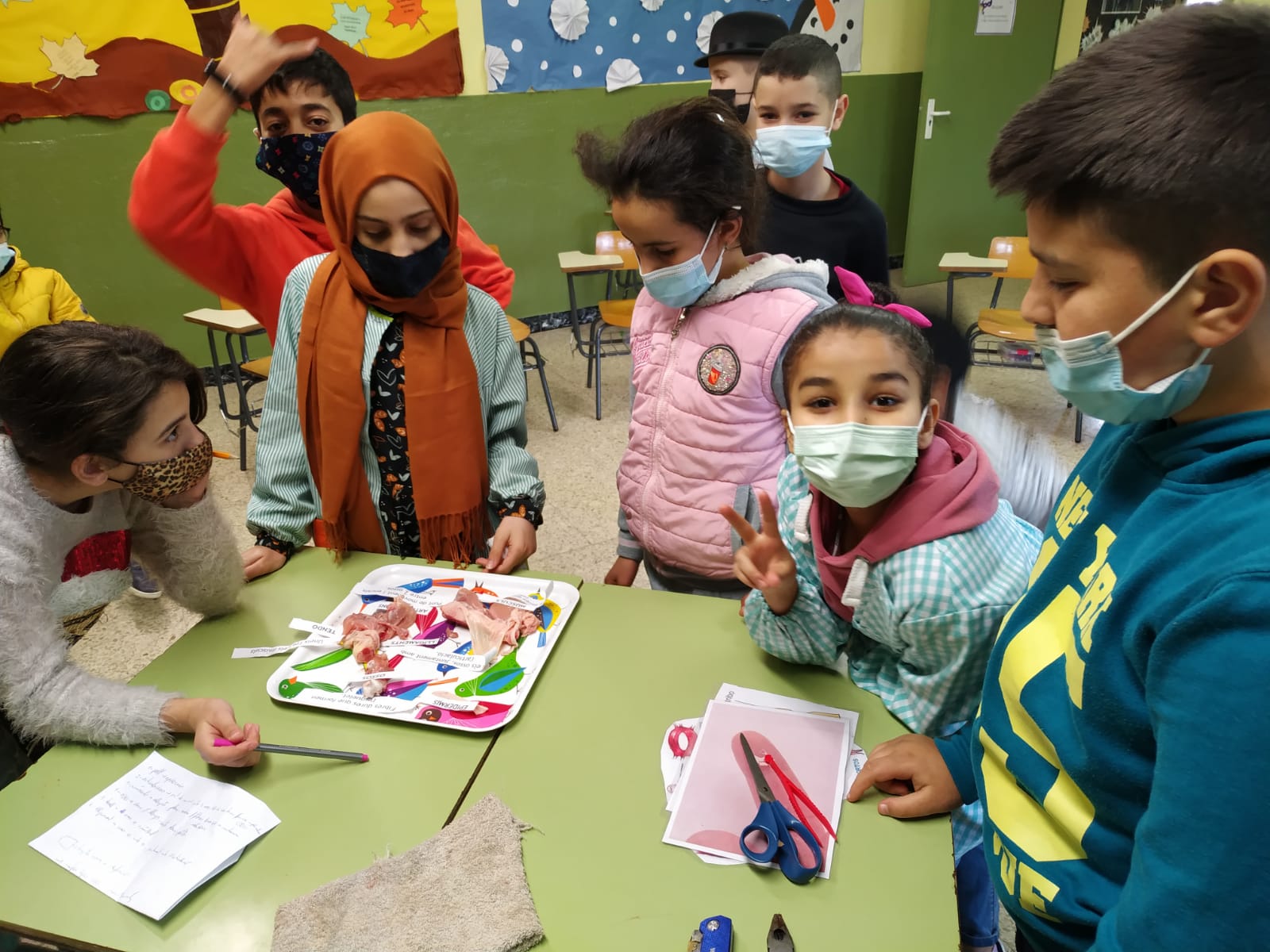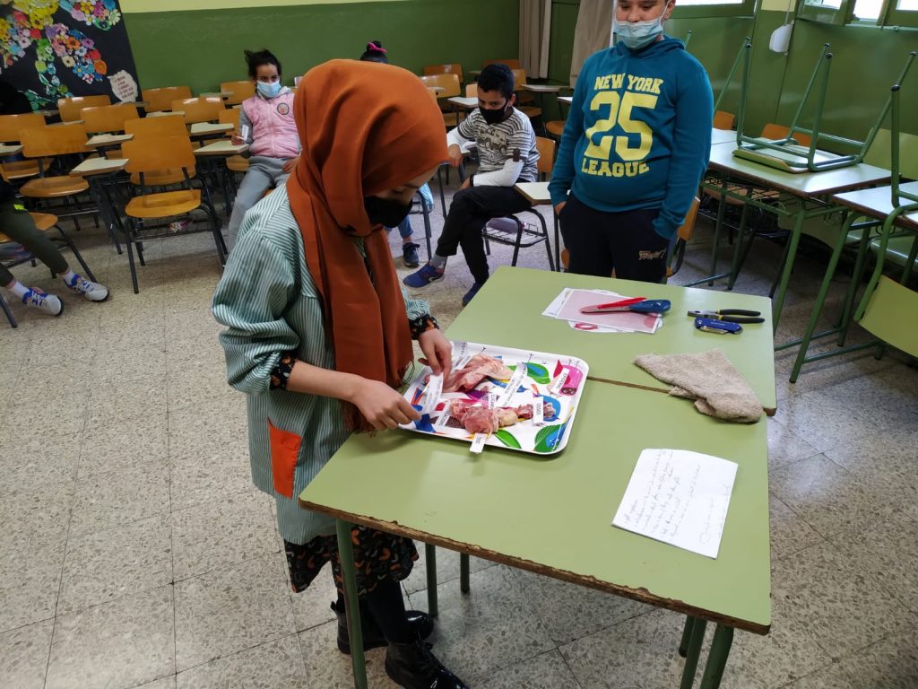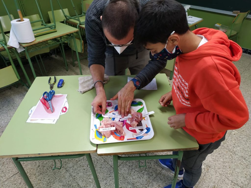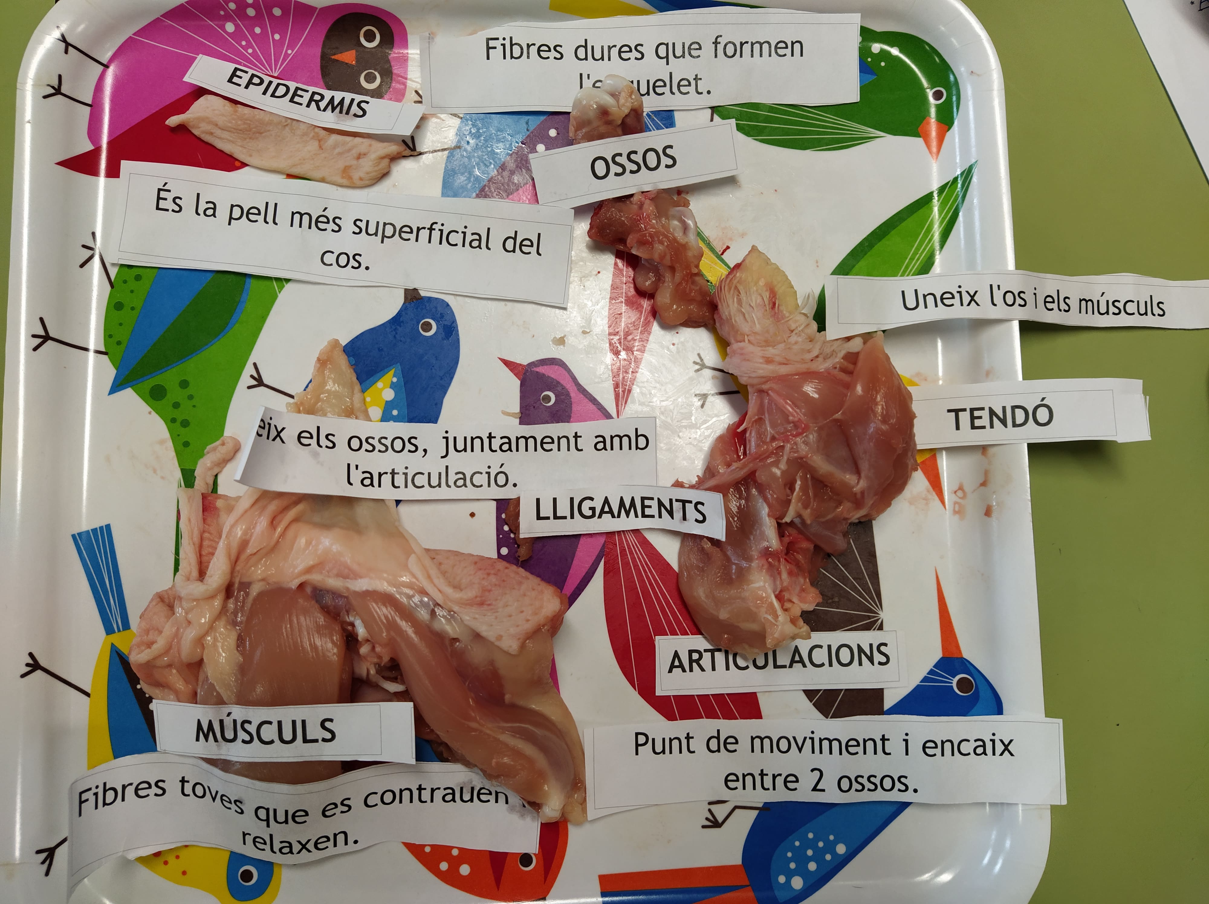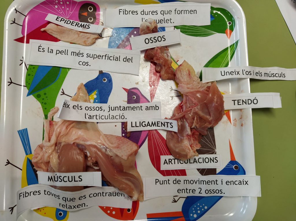 Per tal de poder veure les diferents parts de l’aparell locomotor, avui els i les alumnes de 5è han disseccionat una pota de pollastre.