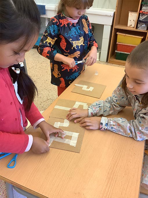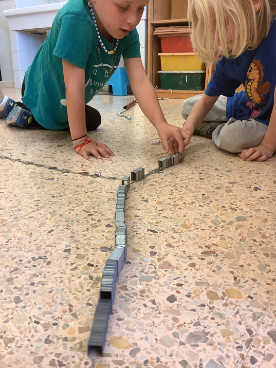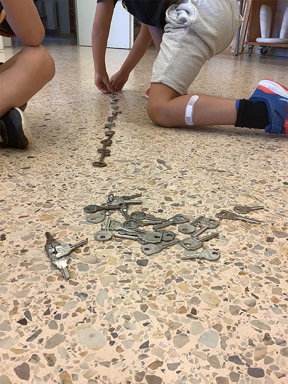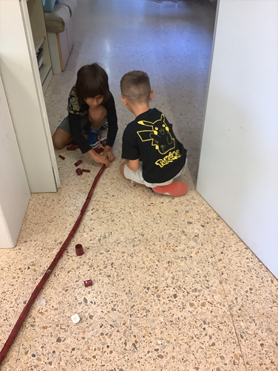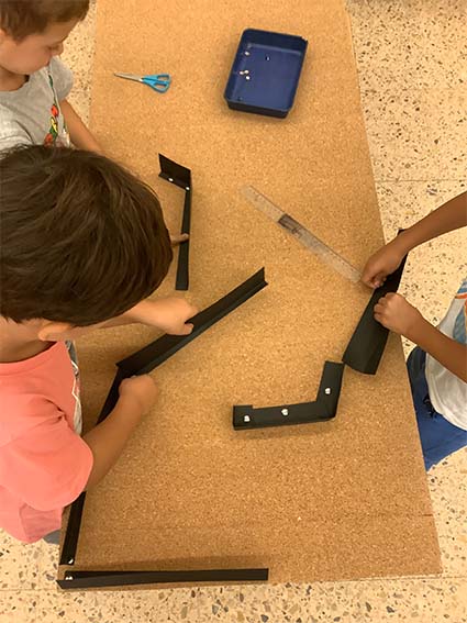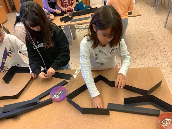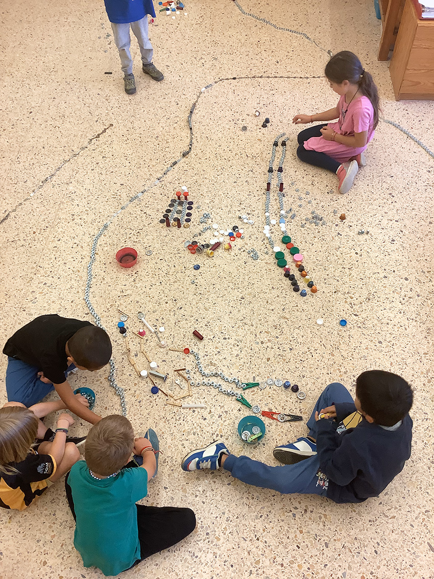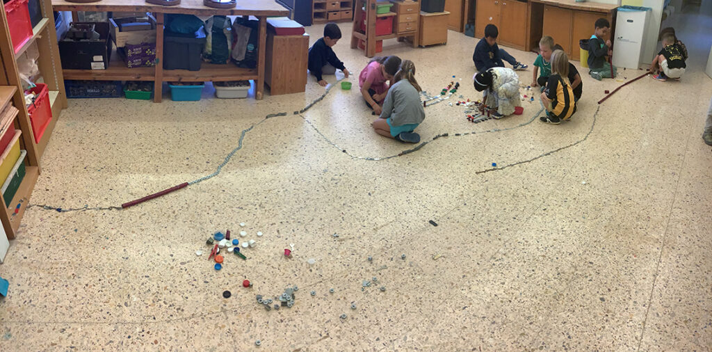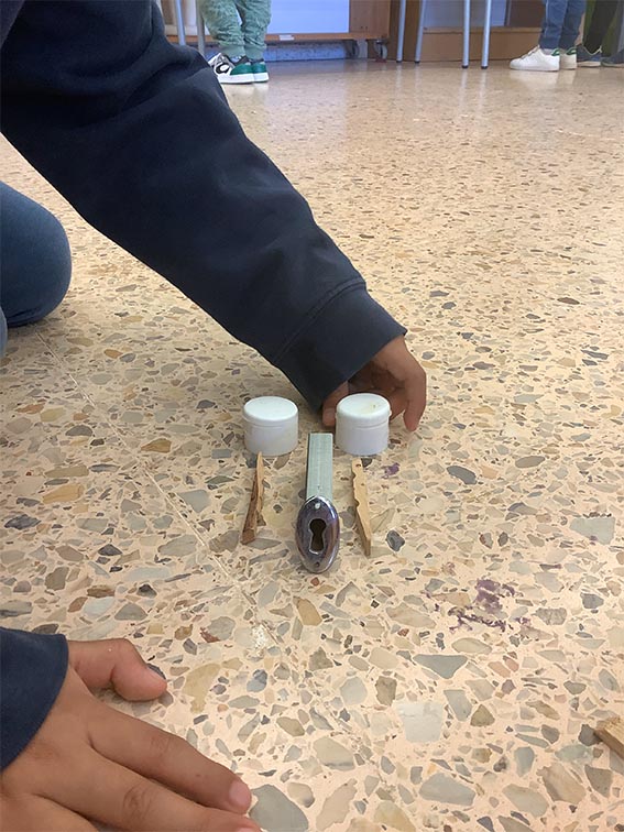 Es tracta d’escollir indrets del taller i fer camins per arribar-hi. Utilitzem claus, femelles hexagonals, càpsules de cafè buides, grapes, taps de plàstic, agulles d’estendre i petits cilindres de metall.