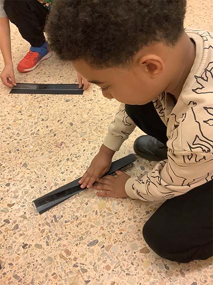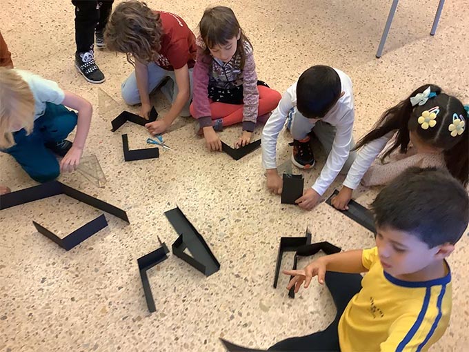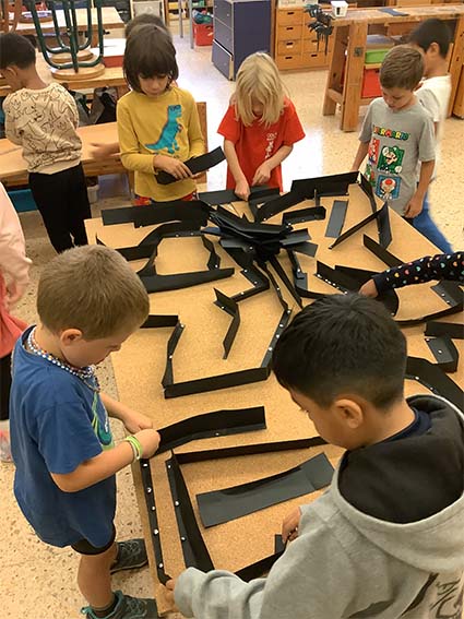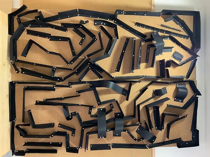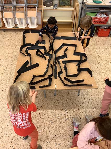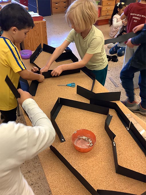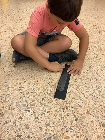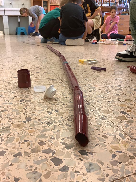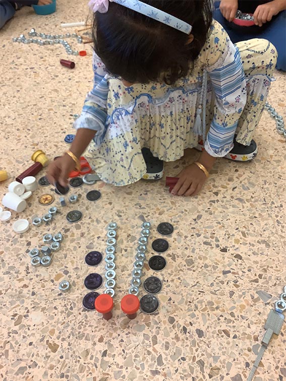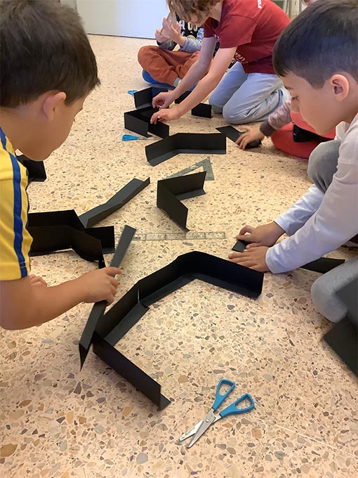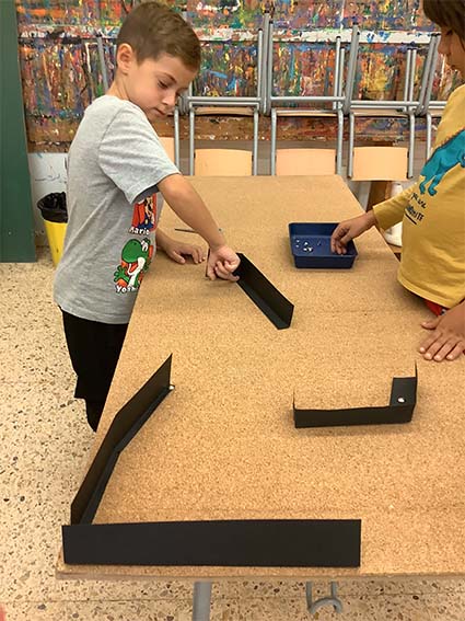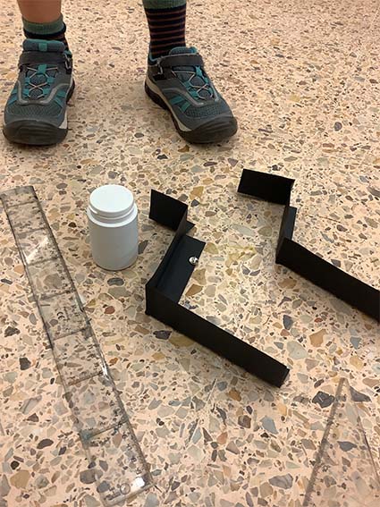 Es tracta d’escollir indrets del taller i fer camins per arribar-hi. Utilitzem claus, femelles hexagonals, càpsules de cafè buides, grapes, taps de plàstic, agulles d’estendre i petits cilindres de metall.