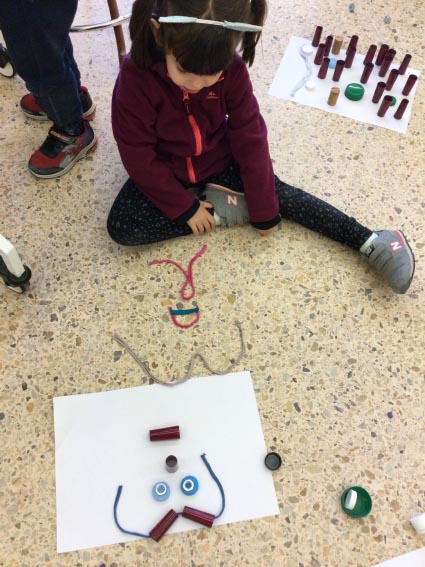 El grup de les SILUETES ens han regalat un joc per fer cares: ulls, nassos, orelles i celles de fusta. Juguem a fer cares, utilitzem caragols i tubs de metall, taps de plàstic, taps de suro i tires de roba de diferents colors.