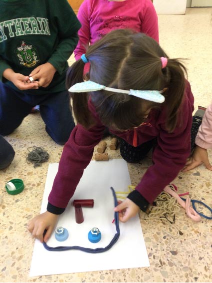 Aquest cop afegim llana per fer els cordons. Foradem, travessem amb la llana, intentem fer nusos, enredem, unir, trepitgem i caminem.