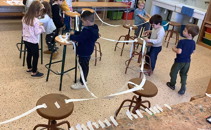 Hem transformat els tamborets en muntanyes i hem fet ponts de paper per unir-les. I com que les muntanyes no són de ningú s’ha treballat en equip!