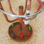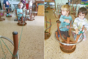 Recuperem la llana que vàrem fer servir l’última vegada, agafem la gran idea de l’altre grup, fer tirolines! Investiguem i descobrim que es poden fer tirolines amb fragments de paper i agulles d’estendre, juguem a buscar la manera de fer lliscar els papers.