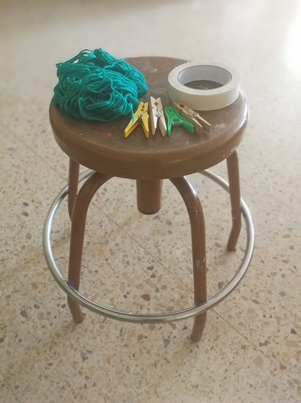 Treballem amb cinta adhesiva de pintor, els tamborets del taller, llana, agulles d’estendre i tisores. Què podem fer amb aquests materials?