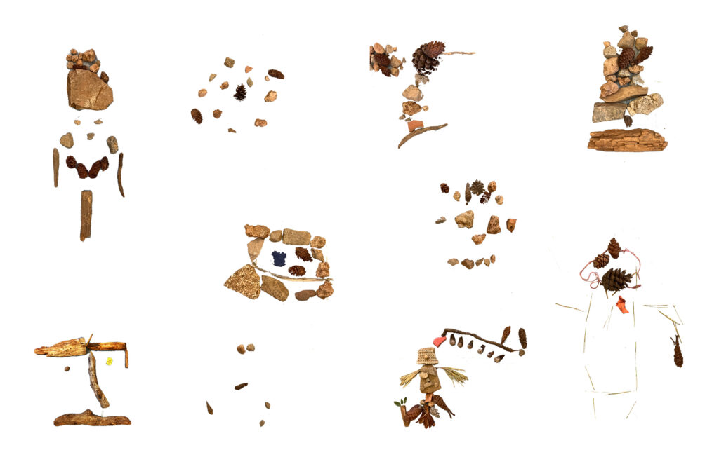 El Cristóbal, el Leo, la Rim i la Fiona han estat poca estona amb nosaltres, però ens han donat molta informació. Per agrair-ho, els regalarem una pila de retrats, dues col·leccions de dibuixos on hem recordat el procés i els materials: el guix, l’aigua, la cullereta per remenar, la sorra fina (Kinetica) i la col·lecció de les coses que vàrem recollir al bosquet.