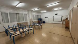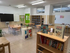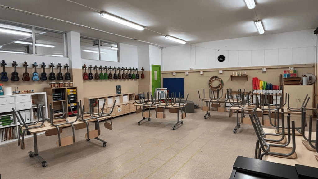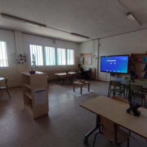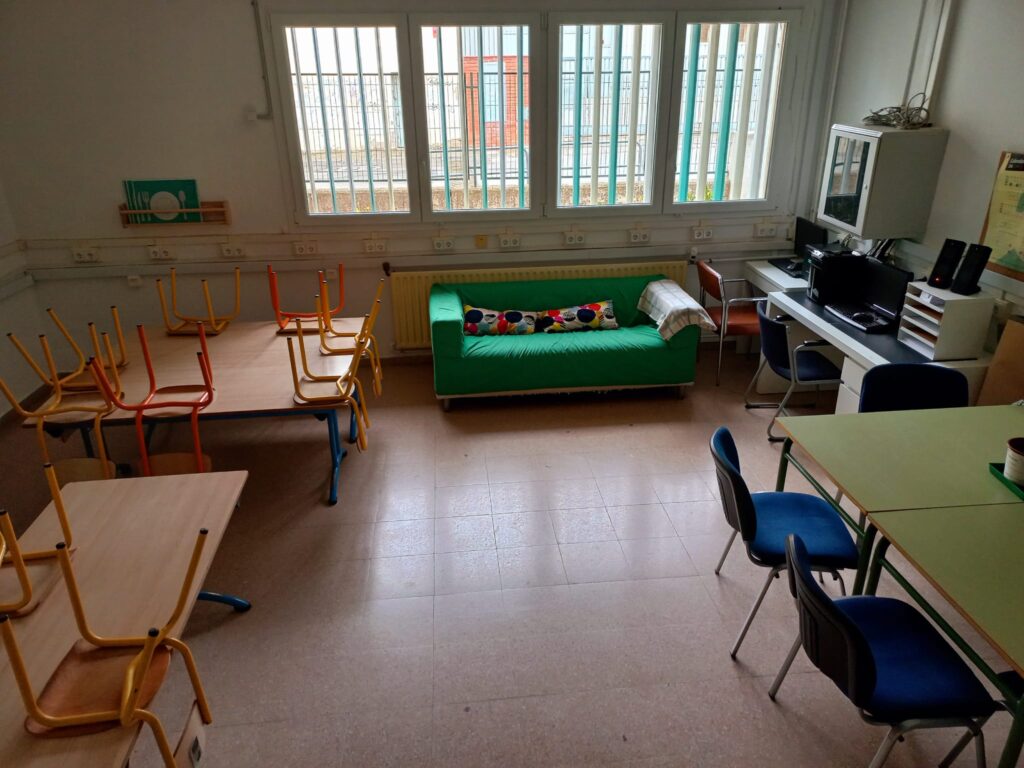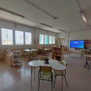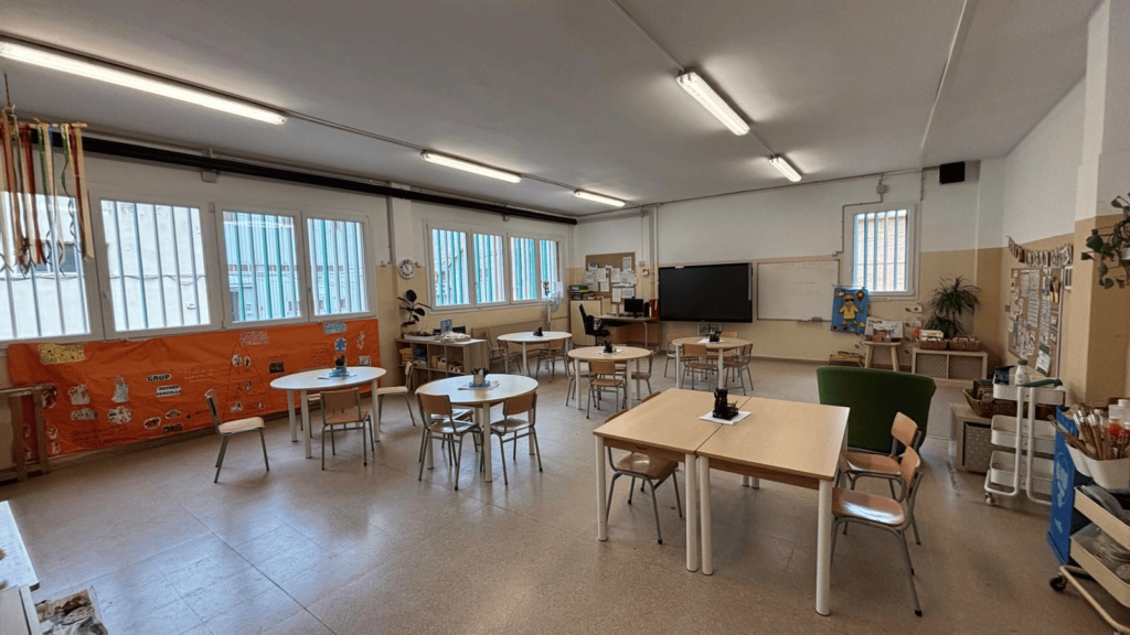 Primera planta: aules de 1r i 2n, lavabos, aula de Música, aula de ràdio, sala de mestres, biblioteca, ambient Baluart i despatx de l’Equip d’Assessorament Pedagògic.