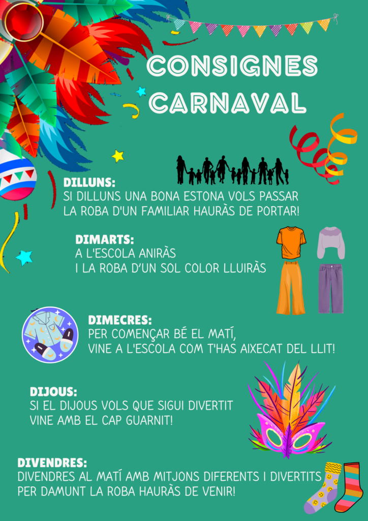 Al llarg de la setmana es proposaran diferents consignes, que no són obligatòries, perquè l’alumnat que ho desitgi pugui participar amb alegria, creativitat i ganes de passar-ho bé.