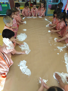 Els Galls i les Vaques experimentem barrejant escuma d’afaitar i pintura. El color és estrany però ens ho hem passat